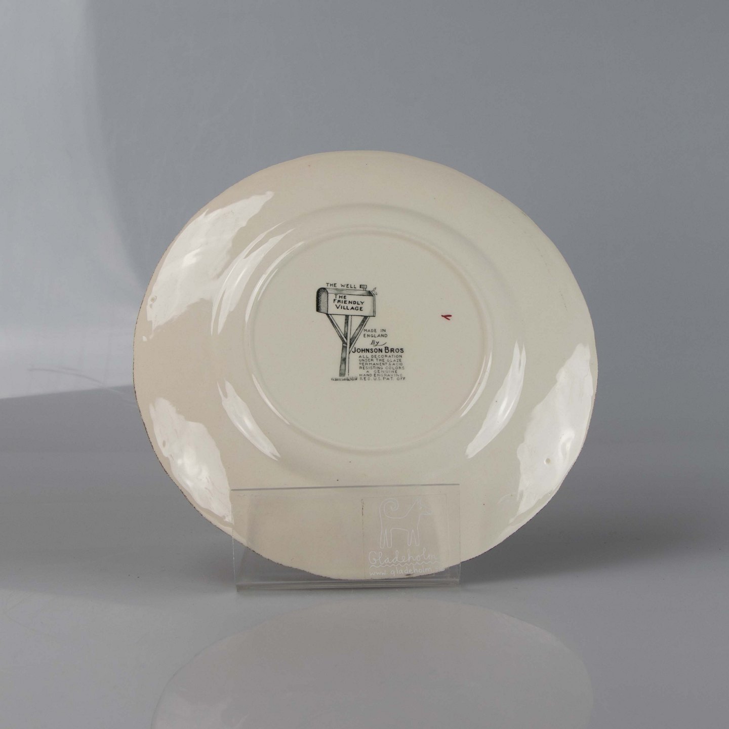 Tallerken i lys fajance med multifarvet landsbymotiv af The well.