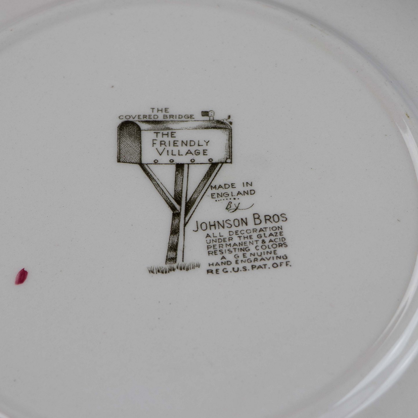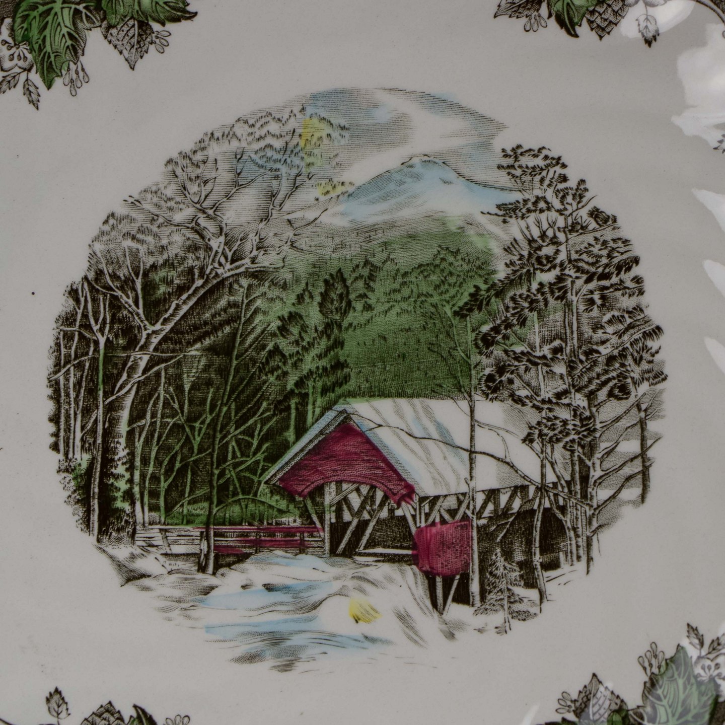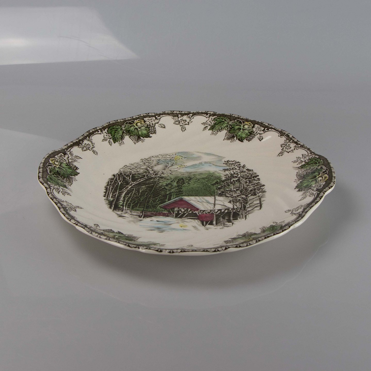 Fad i lys fajance med multifarvet landsbymotiv af The covered bridge.