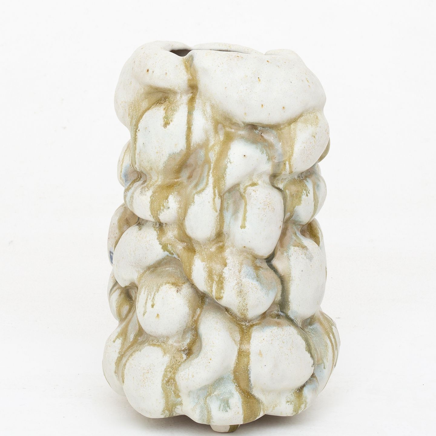 Organic stoneware vase with light and yellow-brown floating glaze.