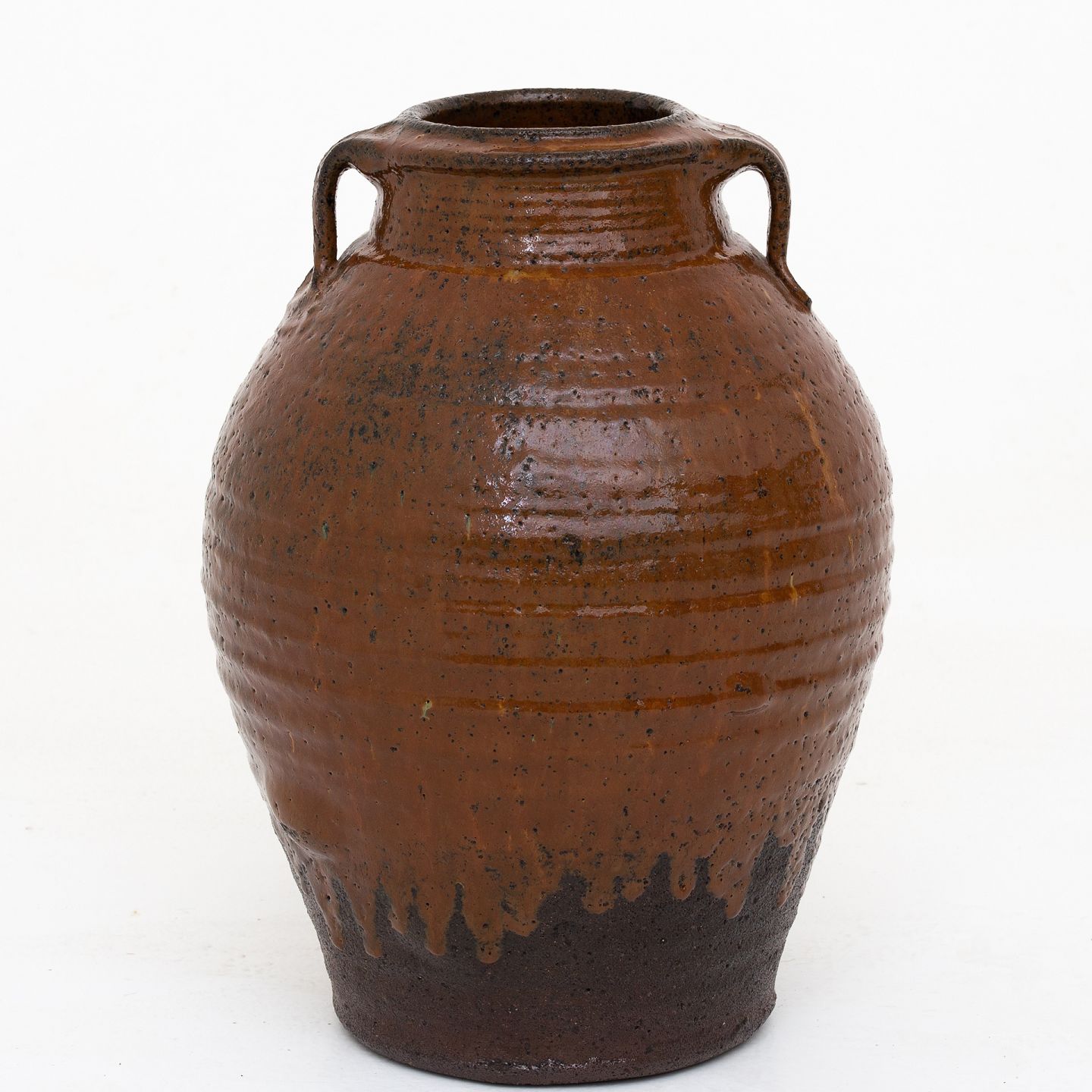 Stor krukke i raku-brændt lertøj med brun glasur.