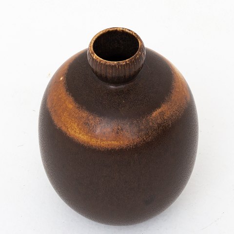 Kalabasformet vase i stentøj med brun harepelsglasur. Model 129. Stemplet.