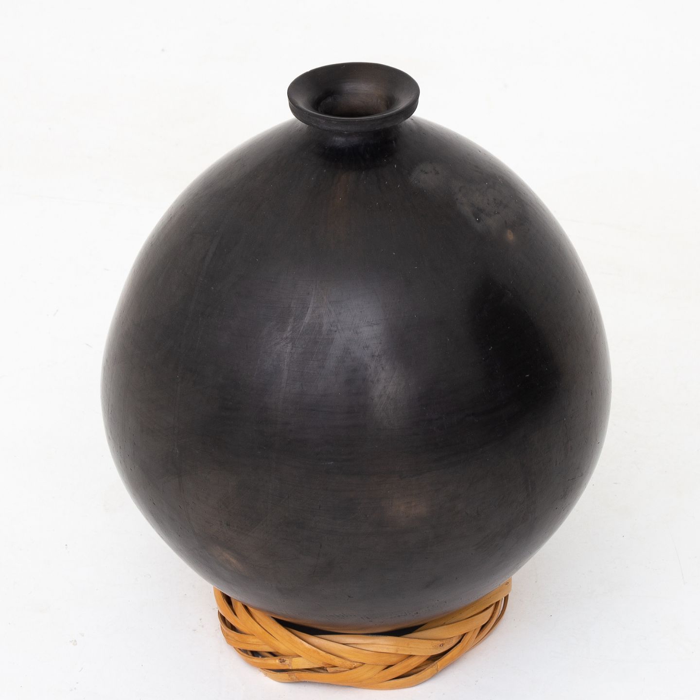 Stor rundbundet krukke i mørkbrændt lertøj på base i flettet bambus.