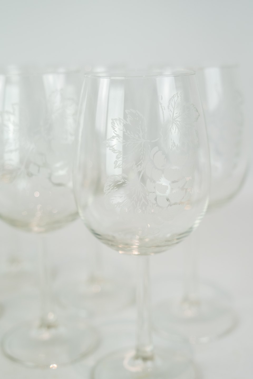 Sæt af seks vinglas dekoreret med druer. Vi har 7 stk. i alt.