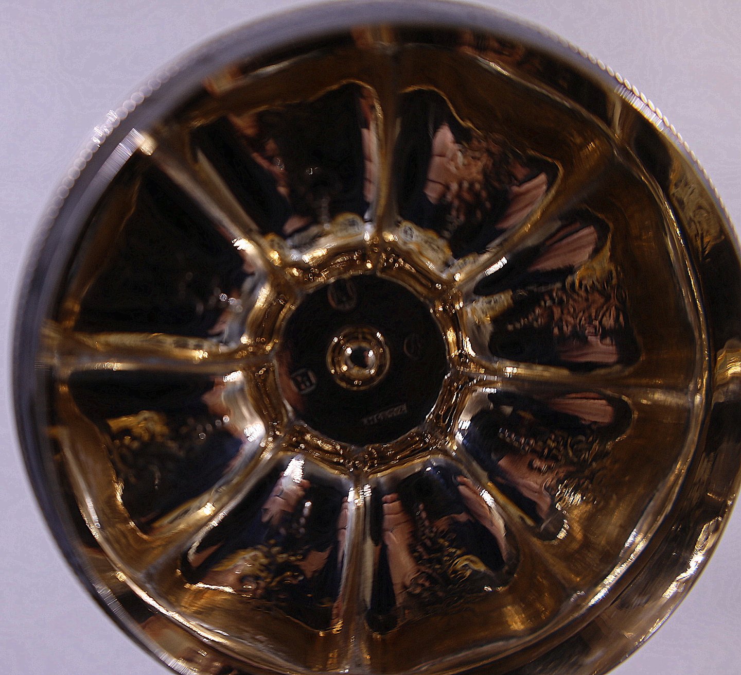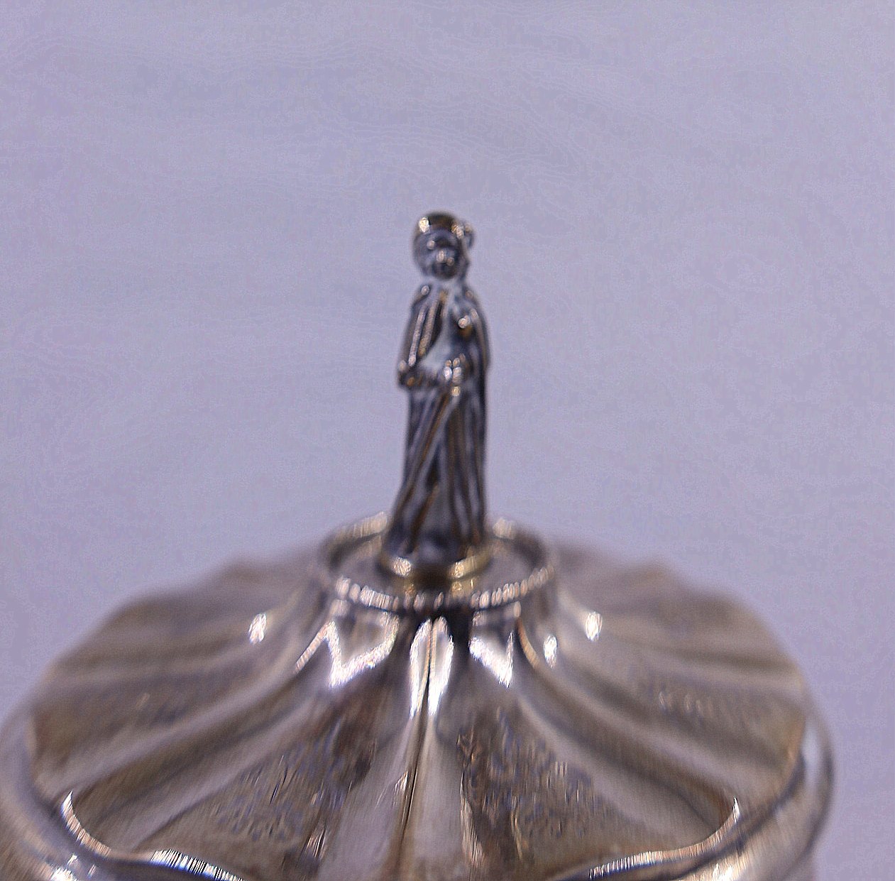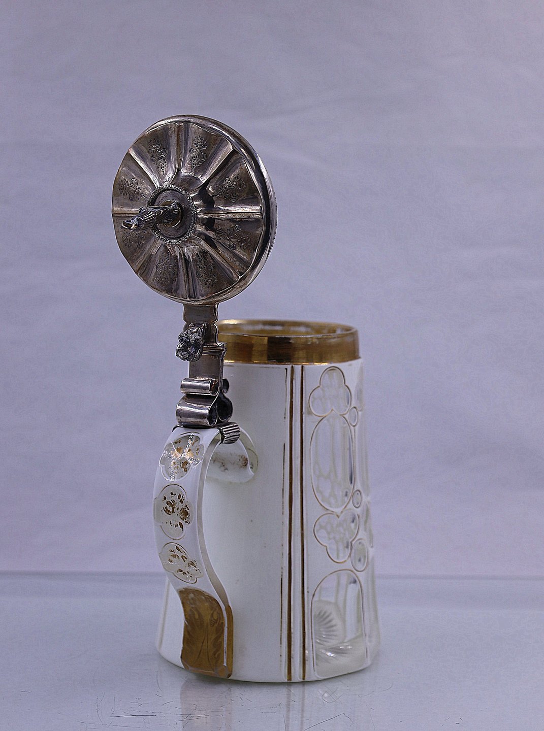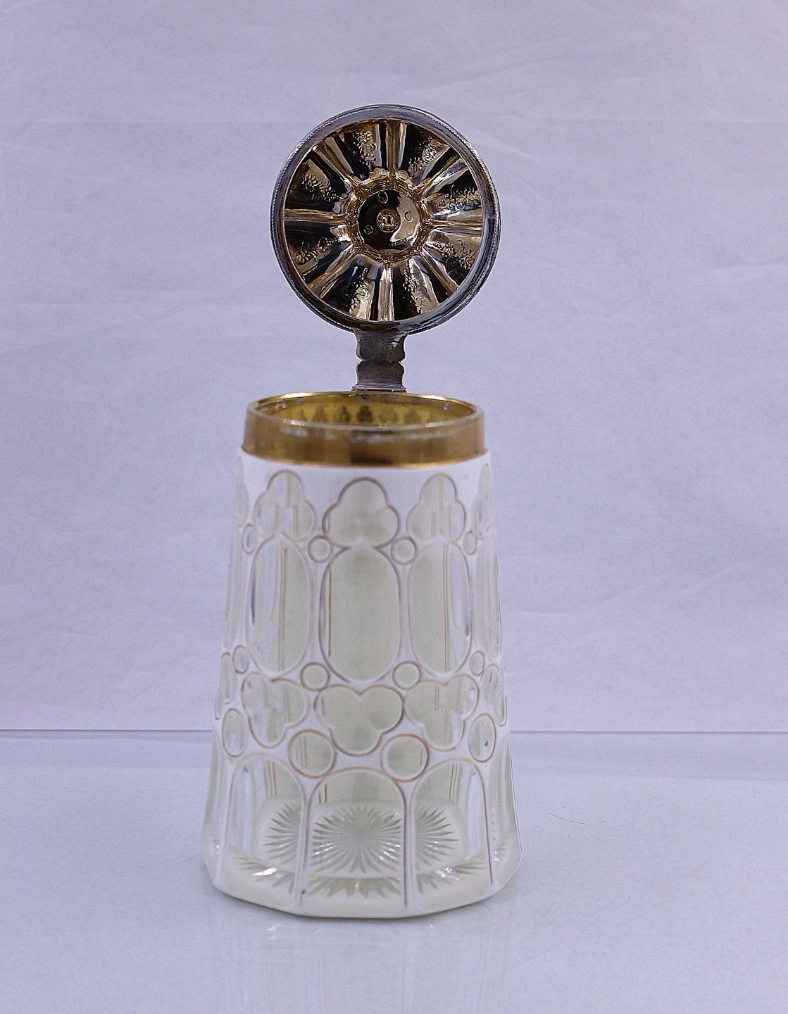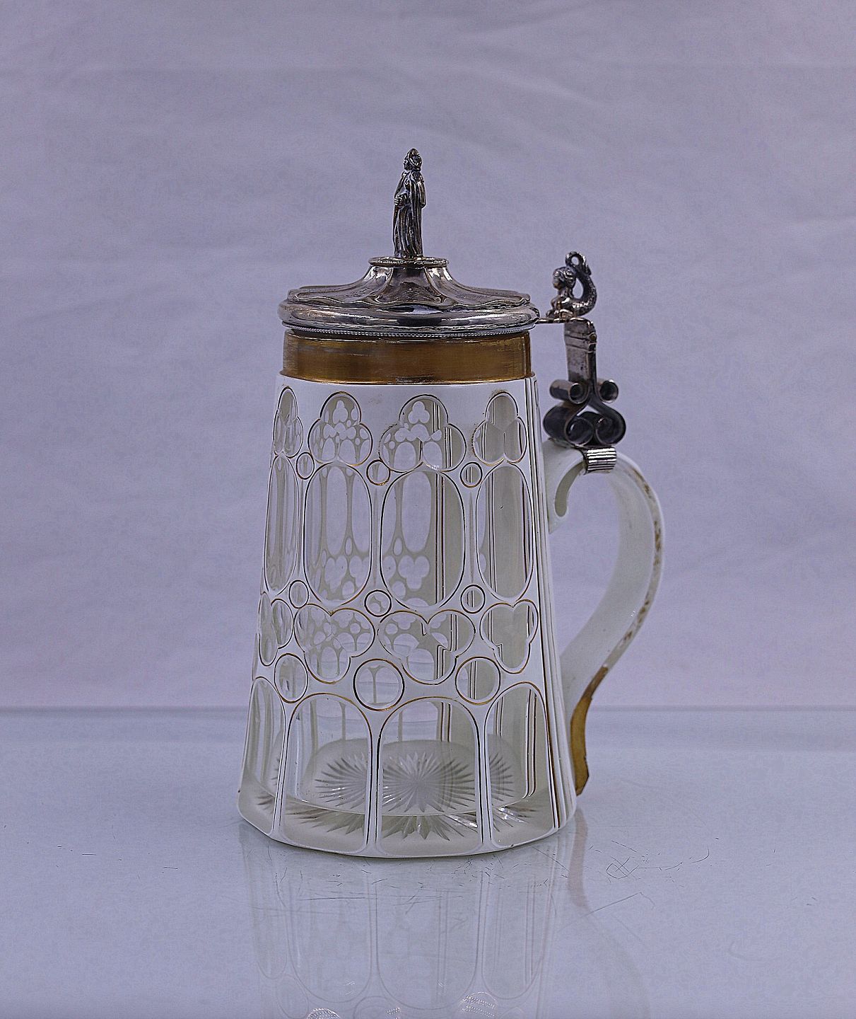 Drikkekrus med vippelåg, på toppen af låget står der en madonna. Glasset er med facetslibninger. Låget er af sølv