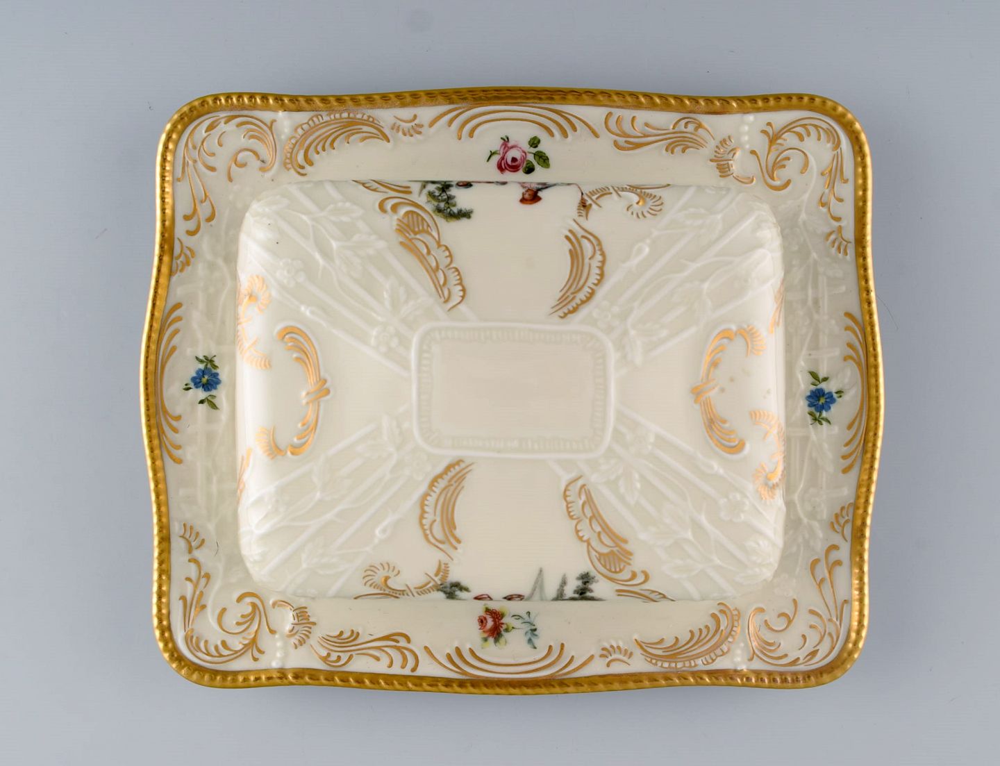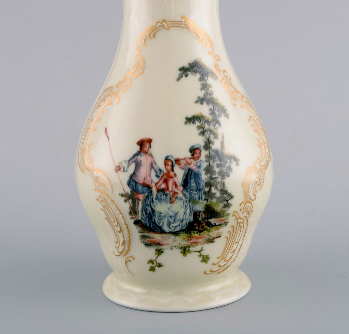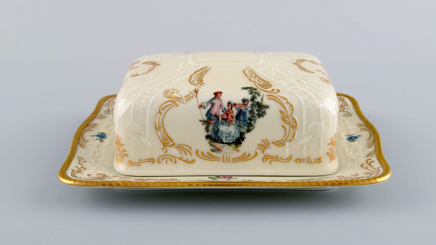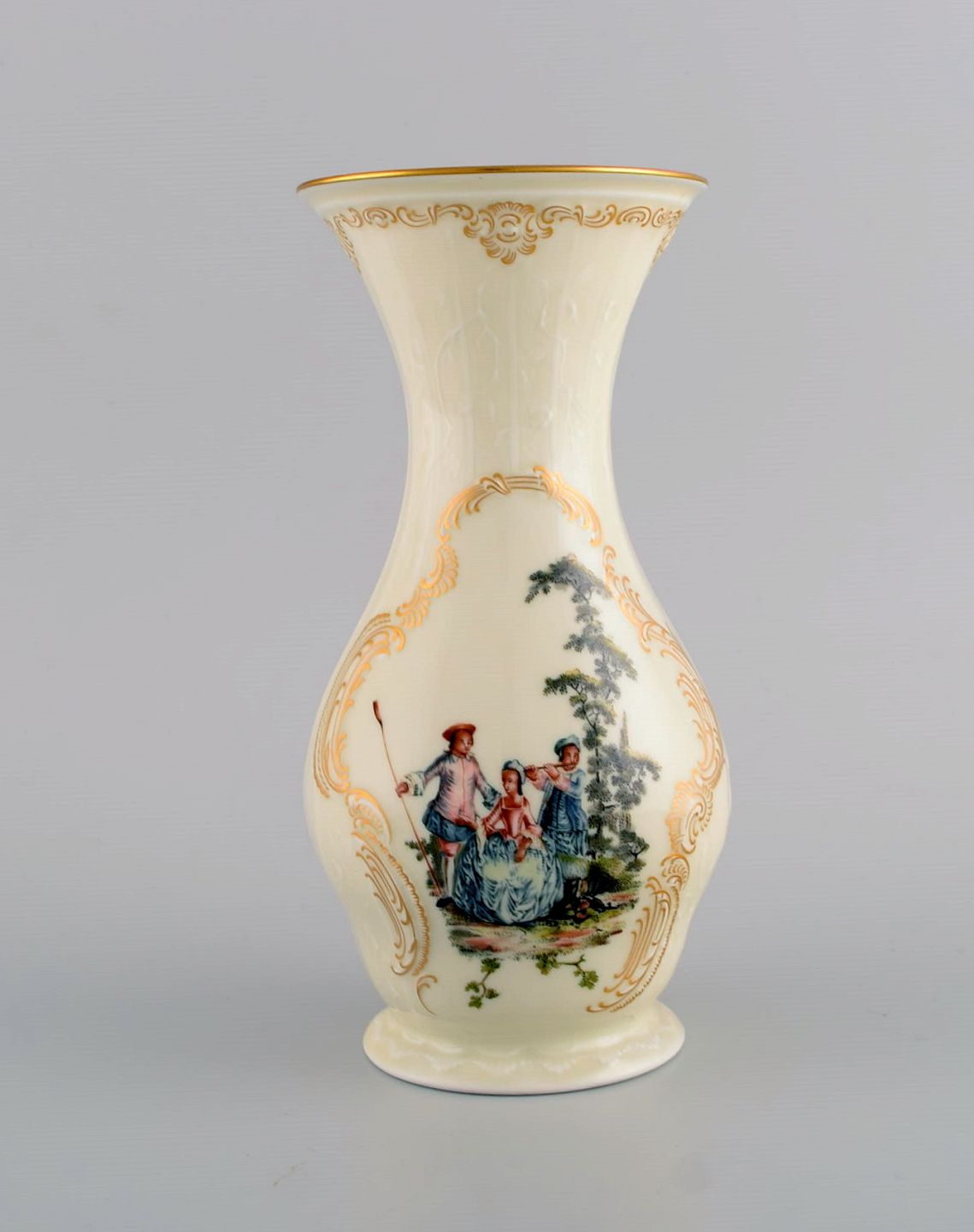 Rosenthal Classic Rose. Vase og smørholder i håndmalet porcelæn med romantiske scener og gulddekoration. Midt 1900-tallet.