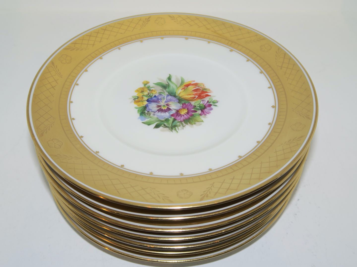 Royal Copenhagen Variant af Guldkurv, lille brød-/kagetallerken med blomsterdekoration og bred guldkant.