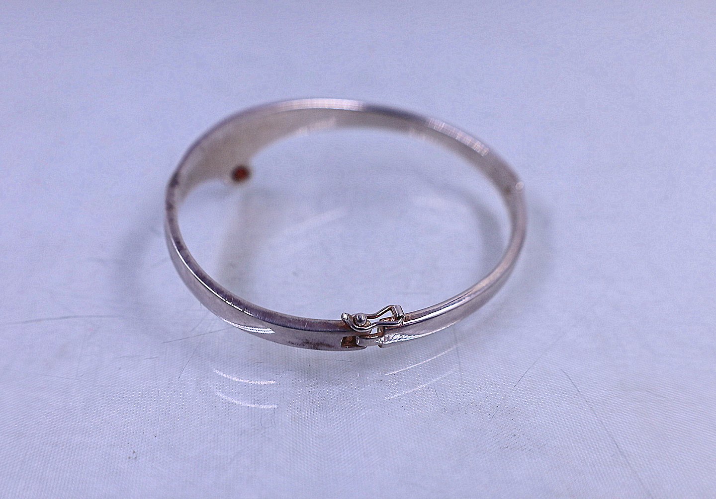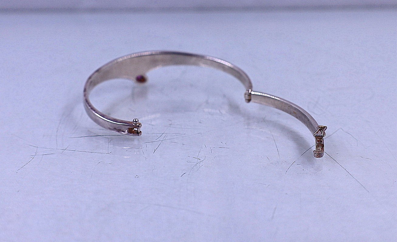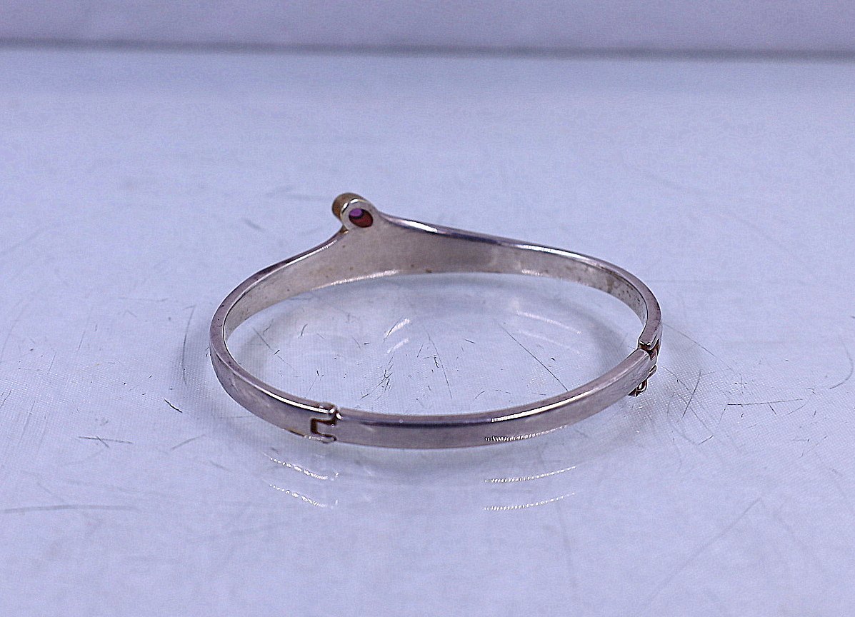 Armring med indlagt guld, 3 klare sten og en lilla sten. Armringen er lukket med sikkerhedslås. 925s sølv. Brugt, men i god stand