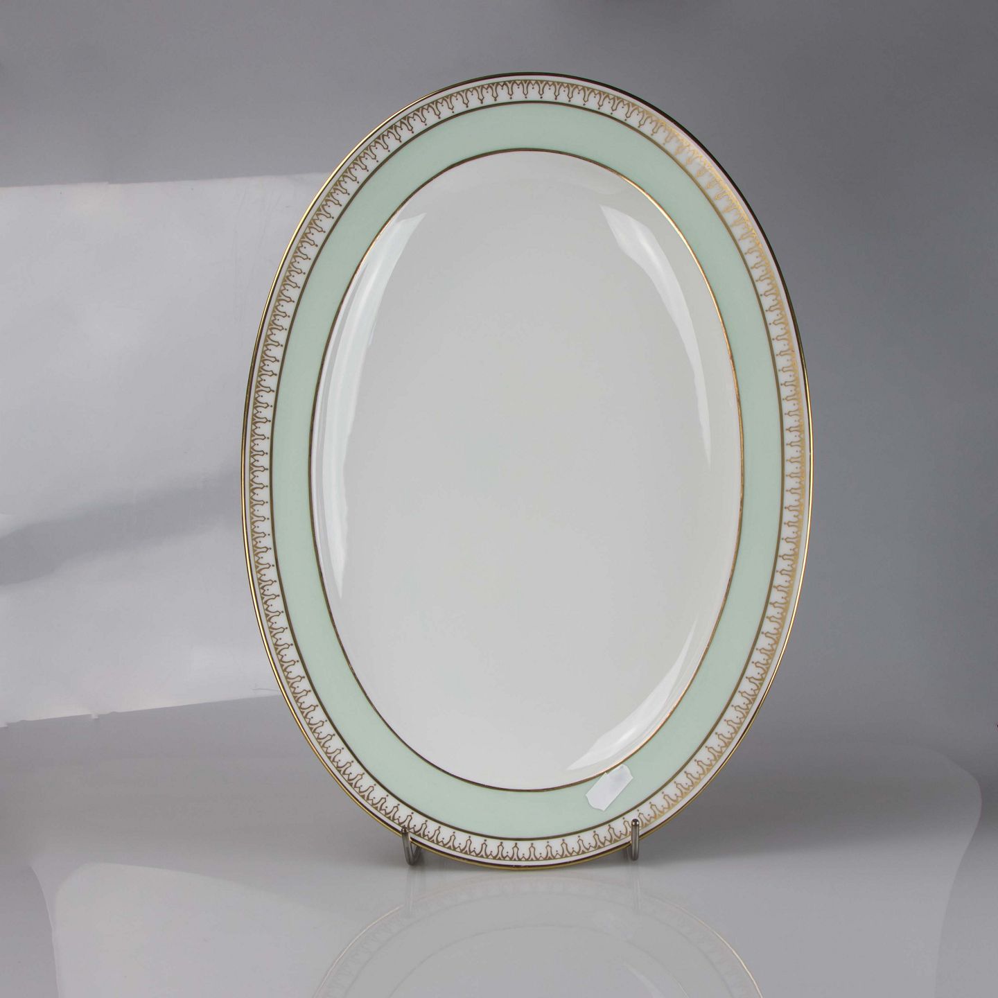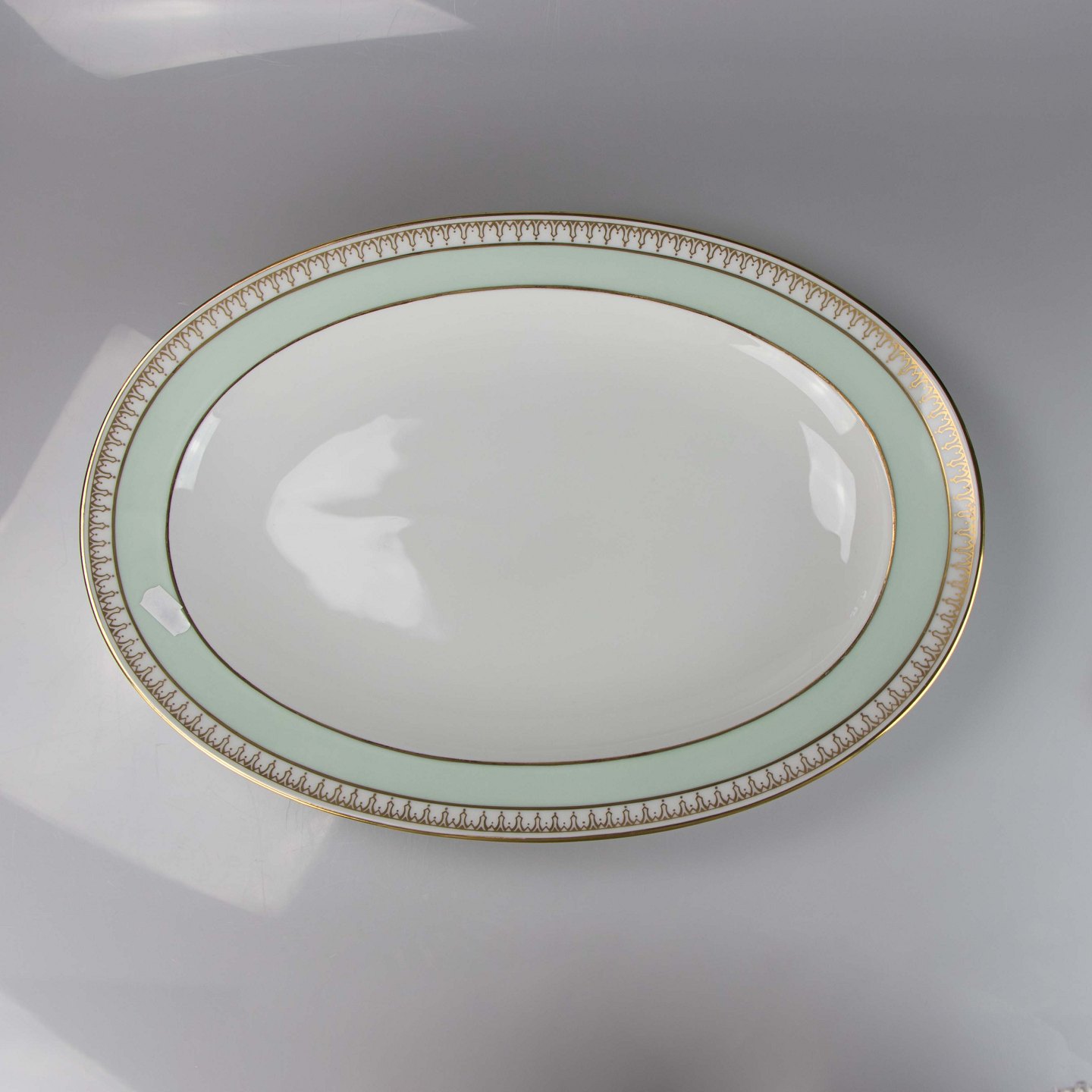 Fad i hvidt porcelæn med lysegrøn kant og gylden dekoration