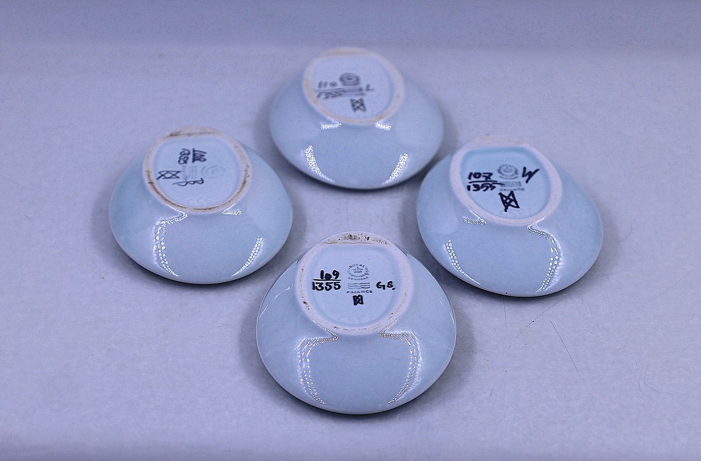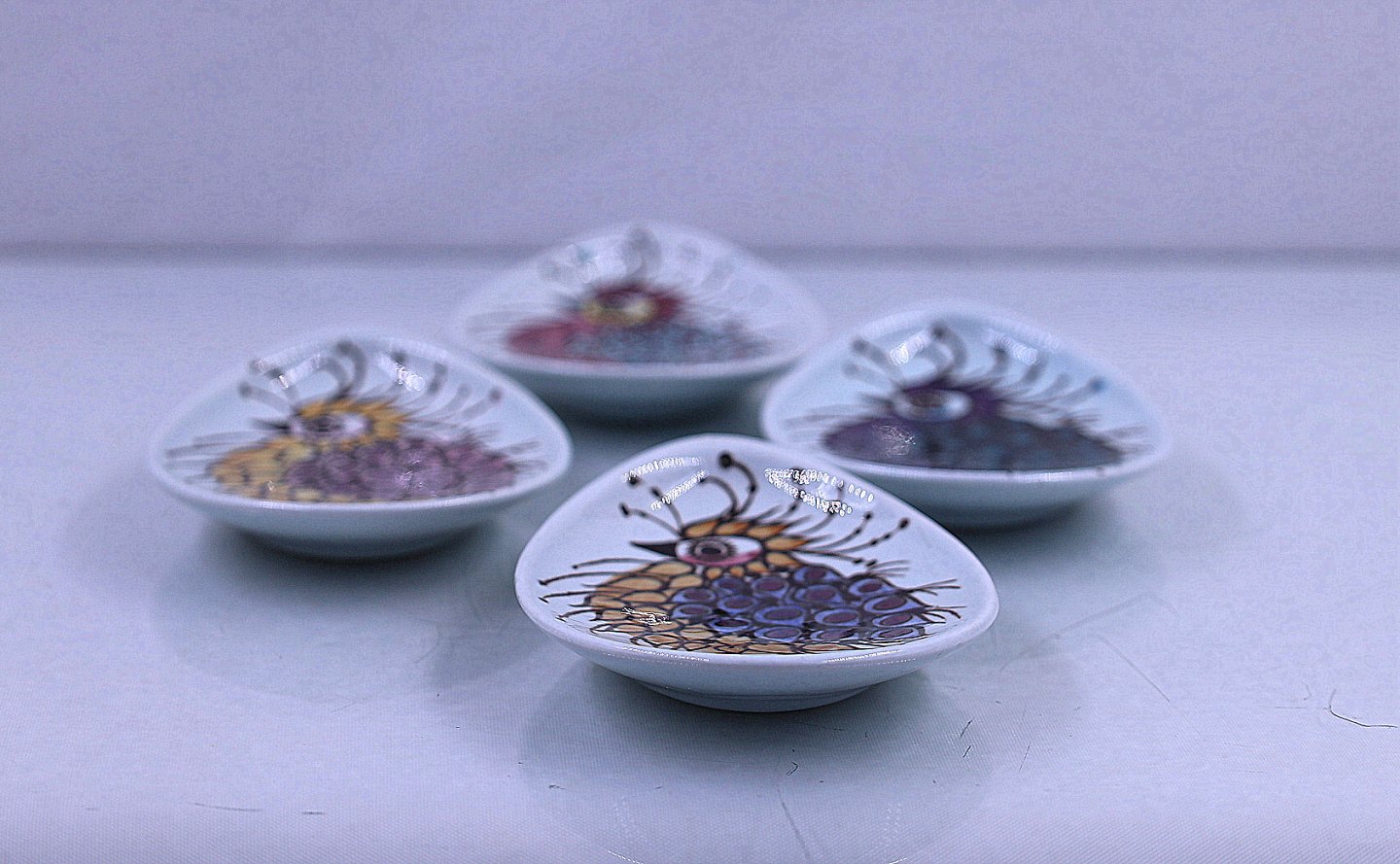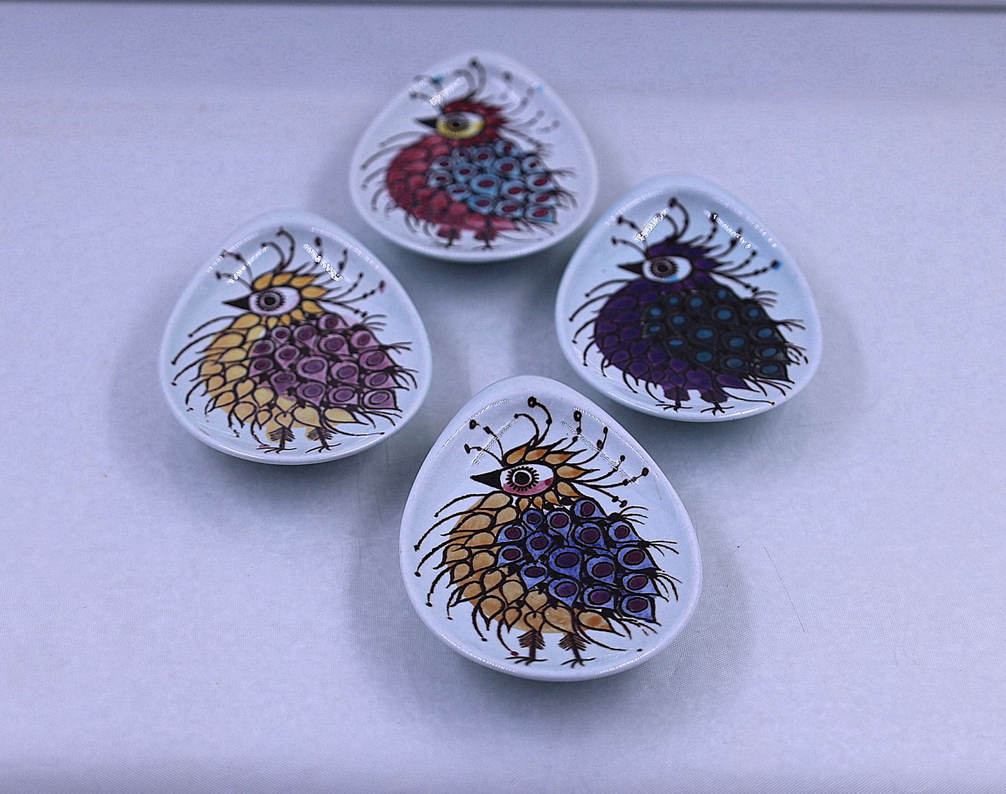 Aluminia, Royal Copenhagen. Sæt= 4stk. Små kuvertskåle med fantasi fugle levende farver. Der er ingen brugsspor.