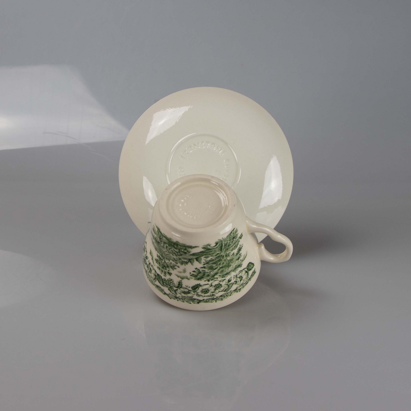 Kop i lyst jernporcelæn med landskabsmotiv i grøn nuance