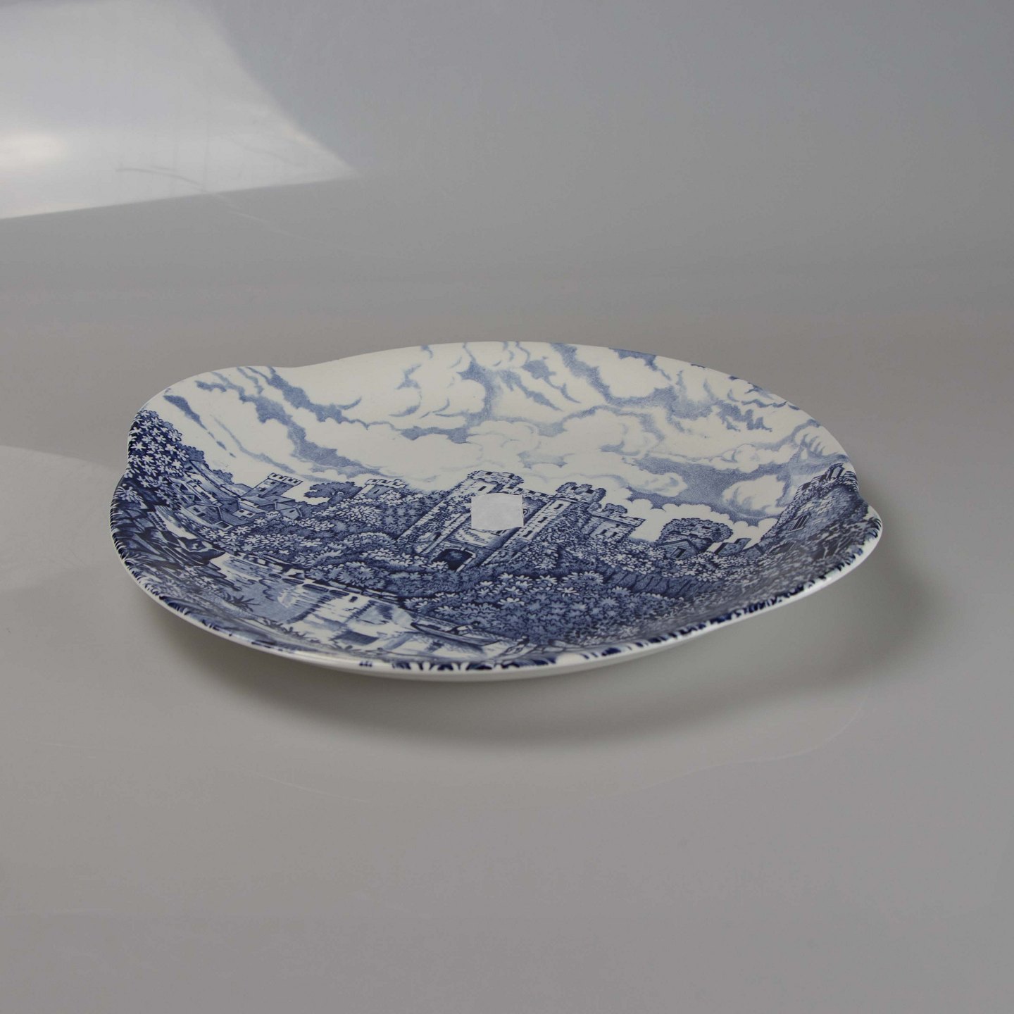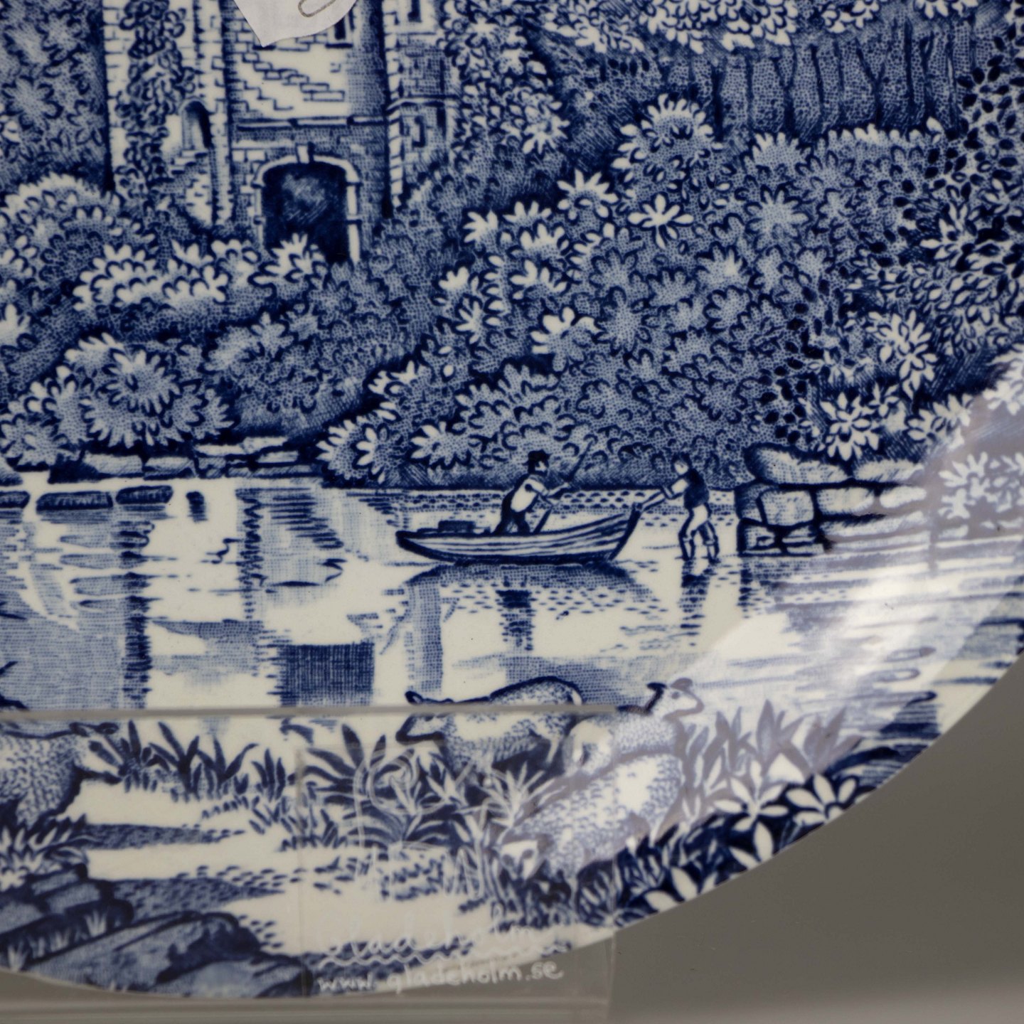 Fad i lys fajance med blådekoreret slotsmotiv.