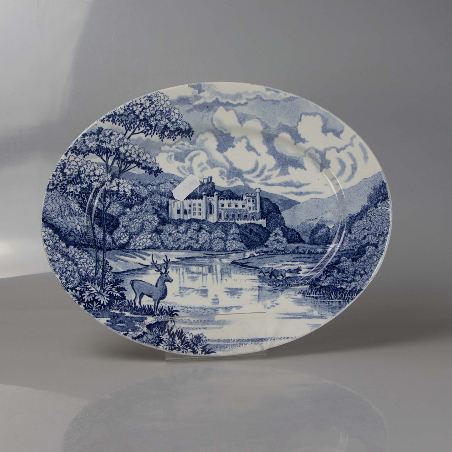 Fad i lys fajance med blådekoreret slotsmotiv.