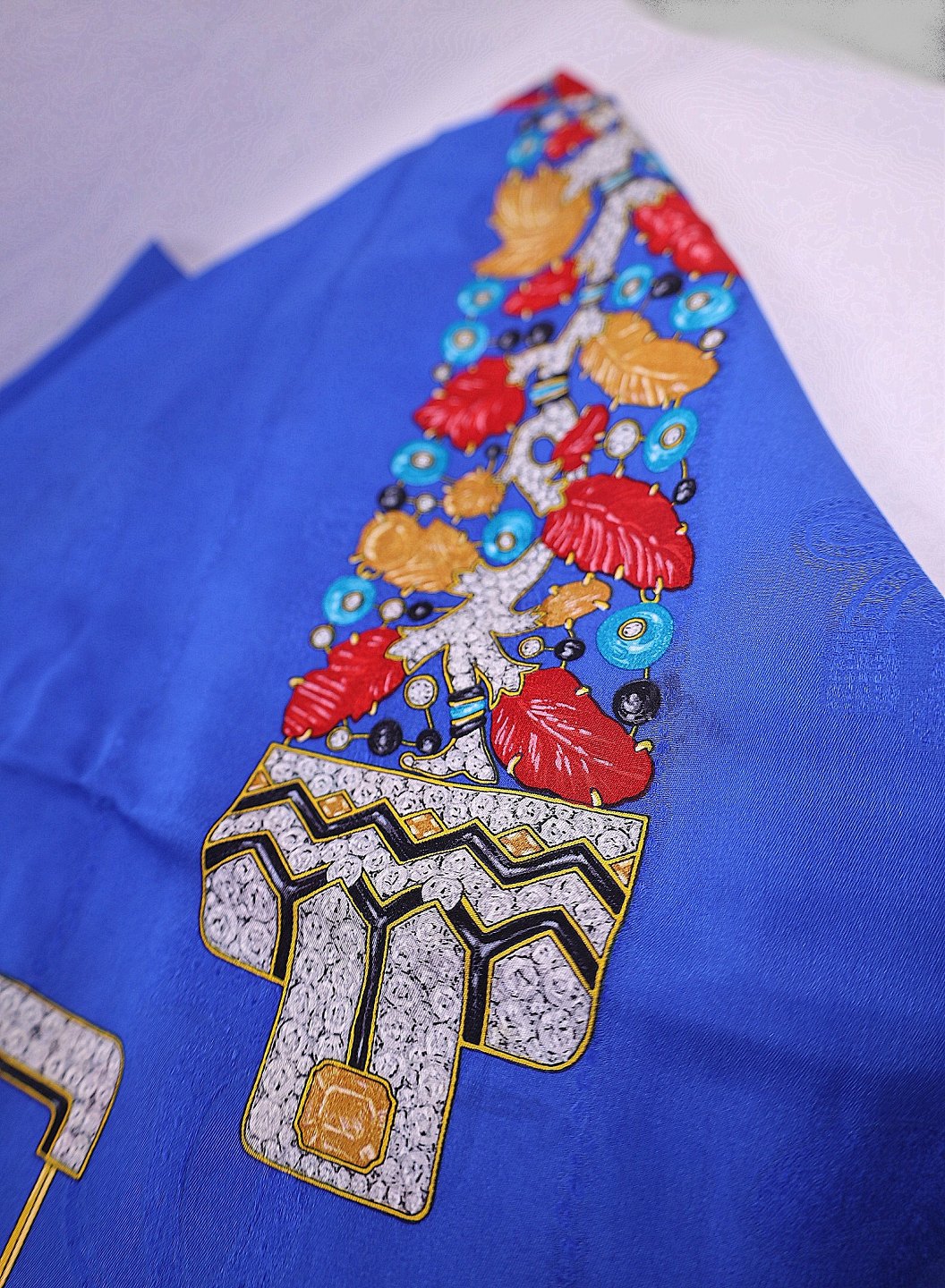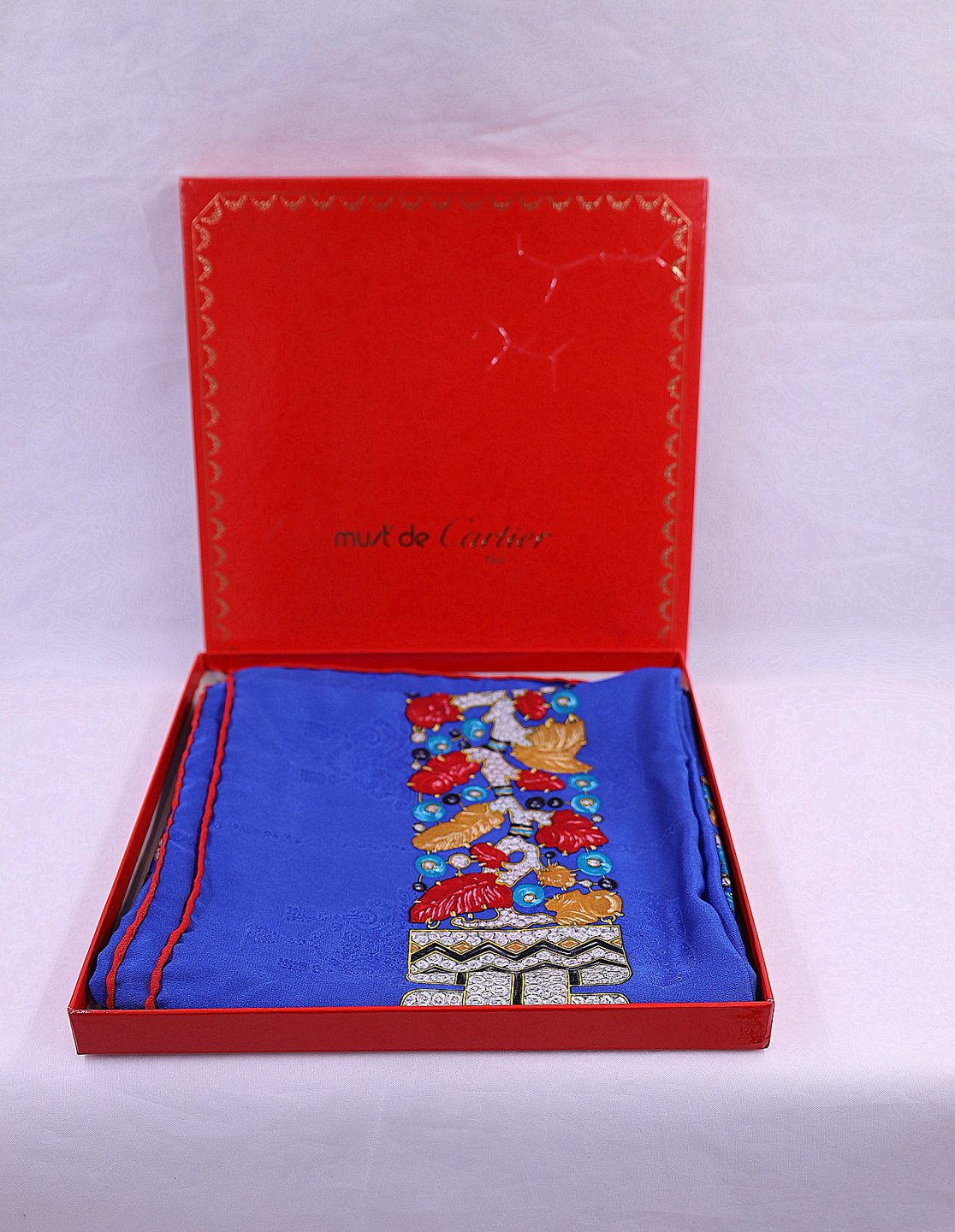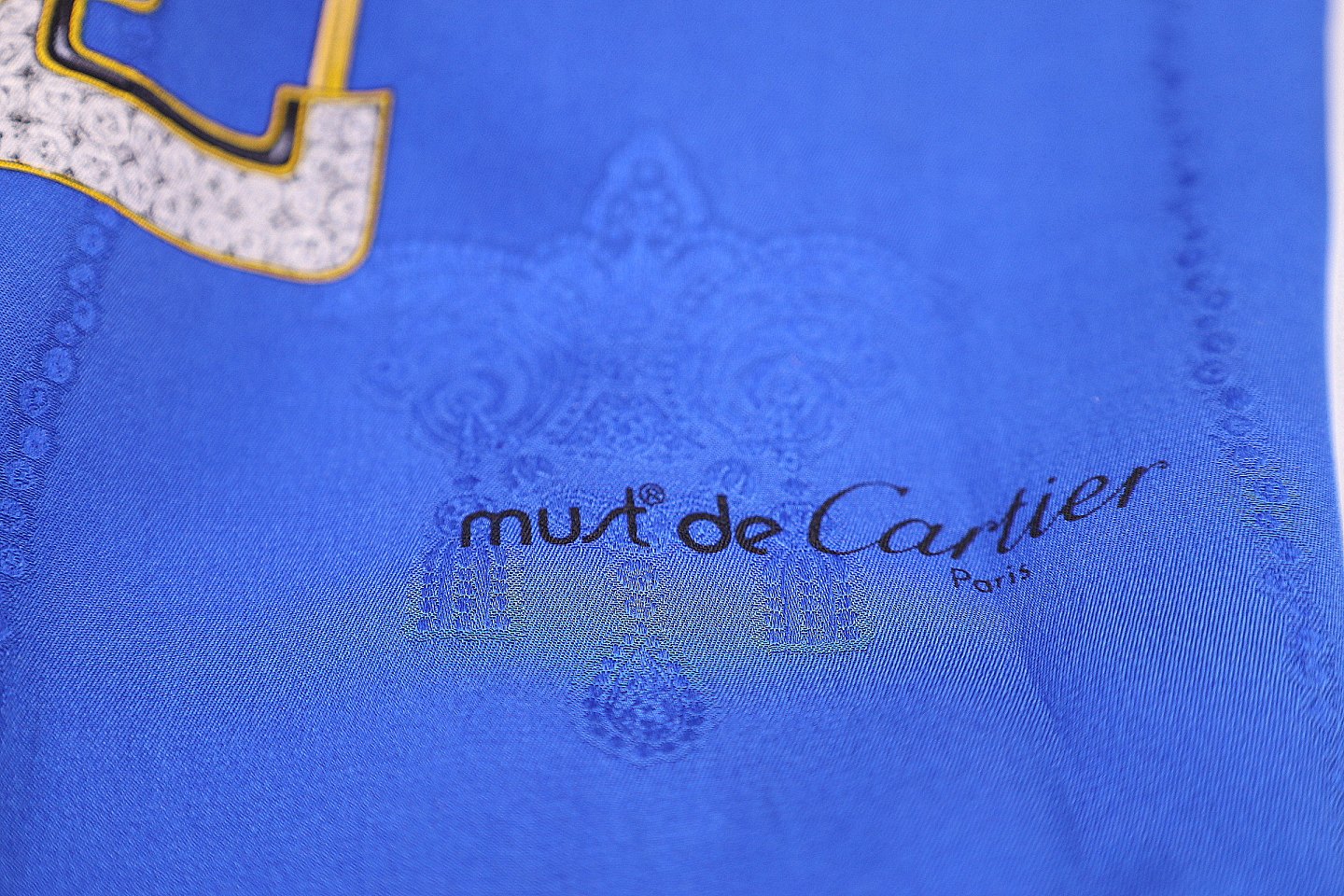 Text available in Danish: Must de Cartier, blåt silketørklæde i originalæske. Firkantet blåt silketørklæde, tørklædet er dekoreret med en bort, hele vejen rundt, borten ligner et bælte med spænde.