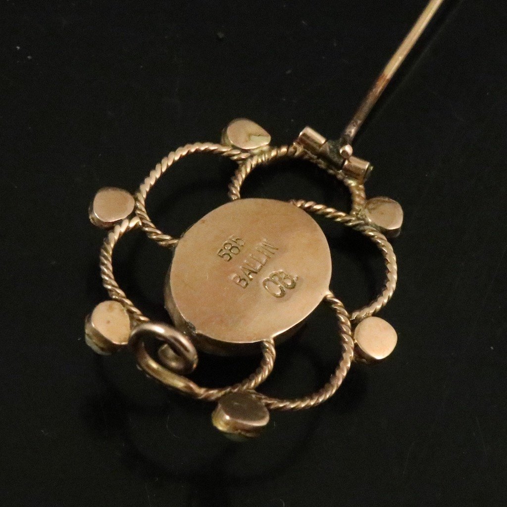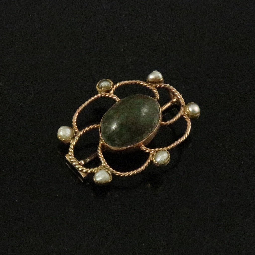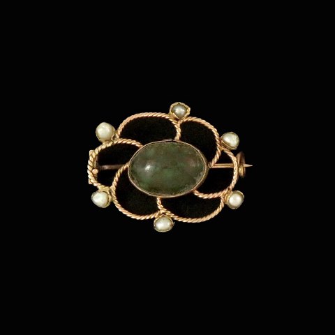 Mogens Ballin. Skønvirke Broche i 14k guld med orientalske perler og turkis.