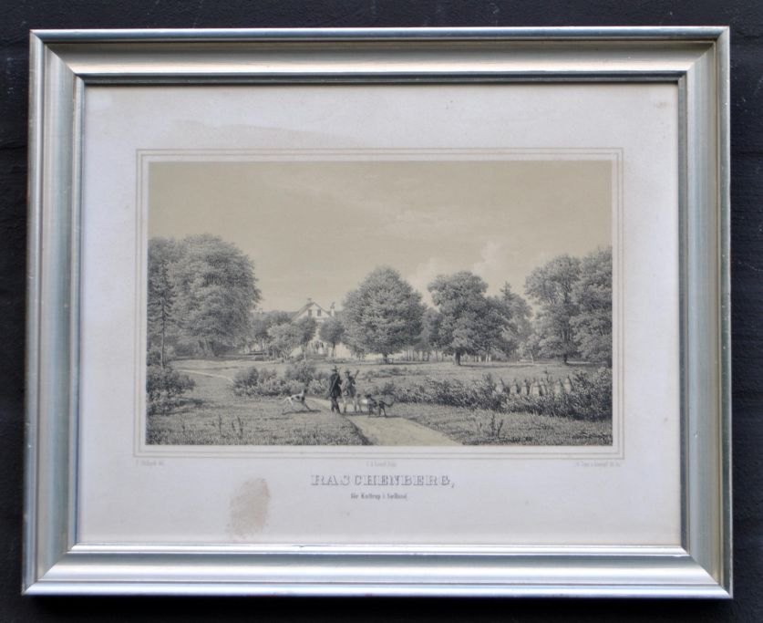 Dansk herregårdsprospekt, litografi, 19. årh. Raschenberg - også kaldet Kattrup ved Kalundborg på Sjælland. Udført af F. Richard og trykt hos I.W. Tegner & Kittendorf. København. 26 x 33 cm.