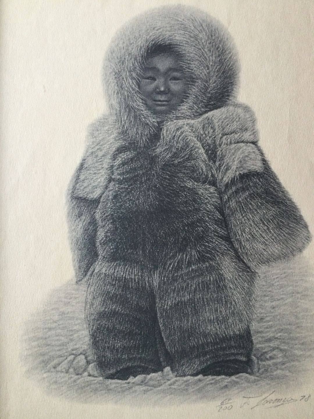 Litografi af Lorenzo Fracchetti 1978 Eskimo barn i parka pels.