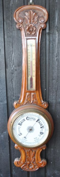Engelsk barometer, 19. årh. Udskåret ege træ. Med temometer. H.: 92 cm.