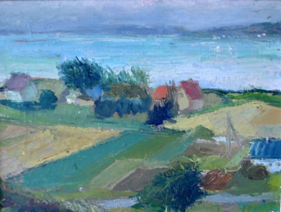 Gelardi, Ruben (1938 - ) Danmark: Landskab. Olie på masonit. Signeret 1969. 43 x 55 cm.