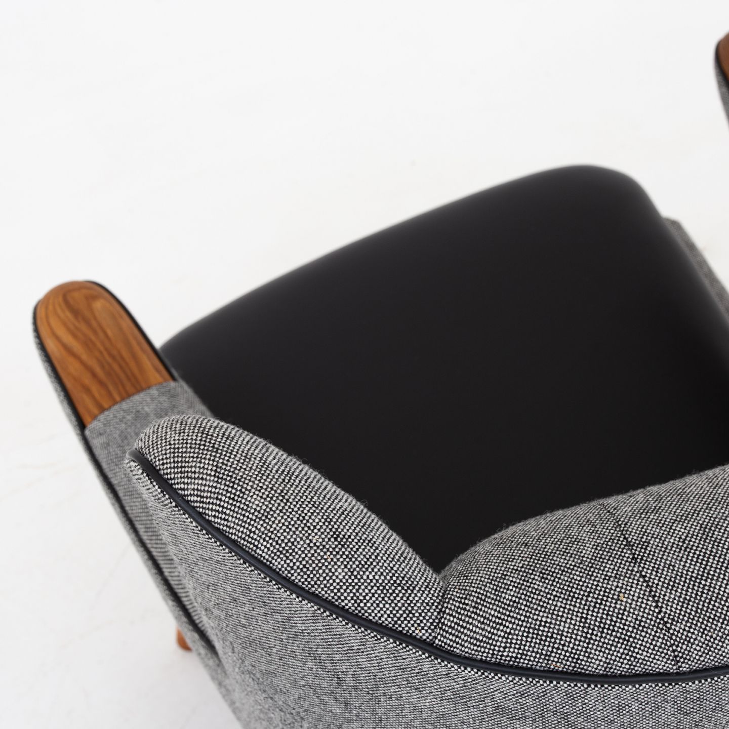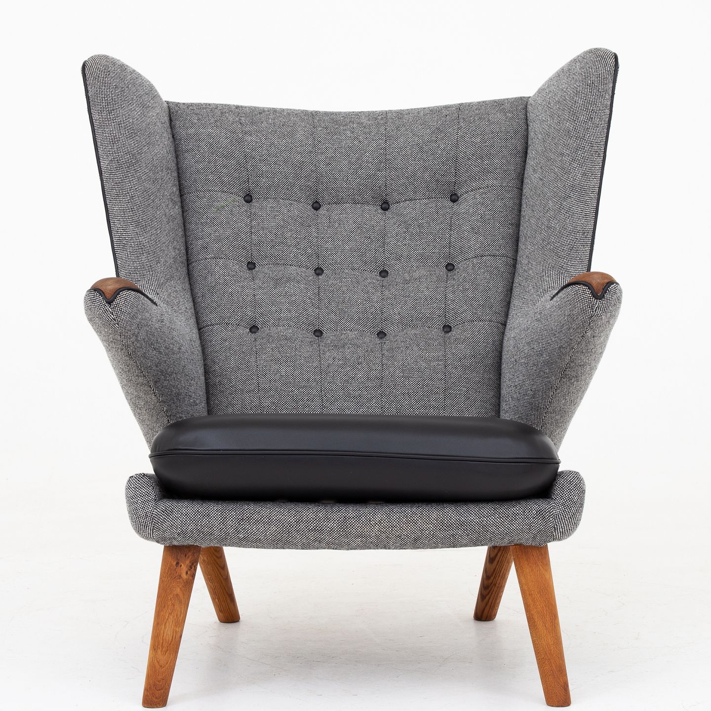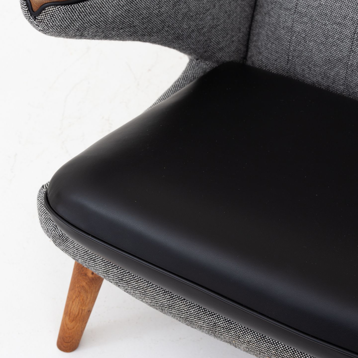 AP 19 - Reupholstered Papa Bear chair in Hallingdal 65 wool (code 166) w. seat and buttons in black leather. Paws and legs in oak. KLASSIK offers upholstery of the Papa Bear chair in fabric or leather of your choice.