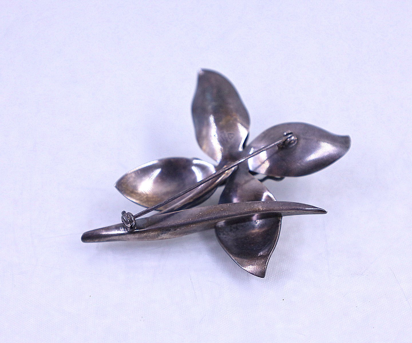 Anton Michelsen. Skønvirke broche i sølv. Broche i form af blomst med stilk og blad. Stemplet AM Sterling/Denmark