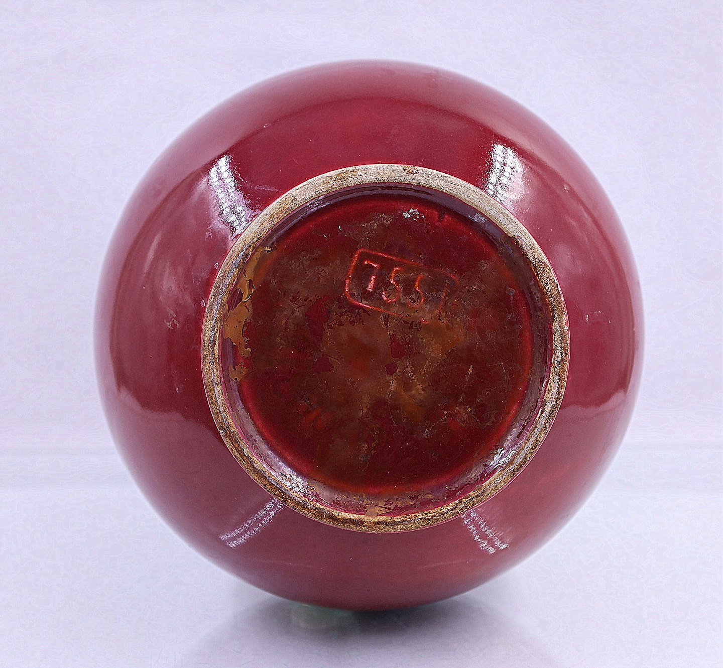Keramik vase, der er glaseret okseblodsrød. Vasens facon er kuglerund.