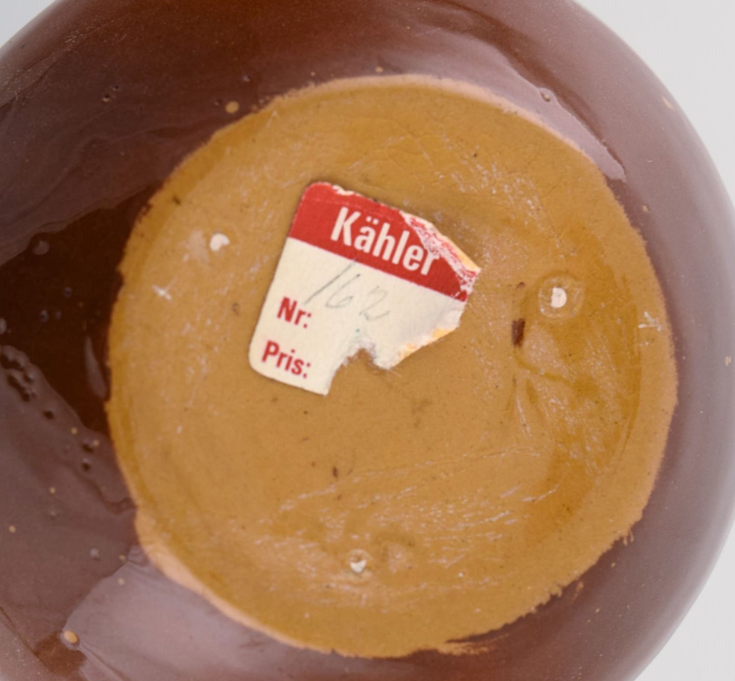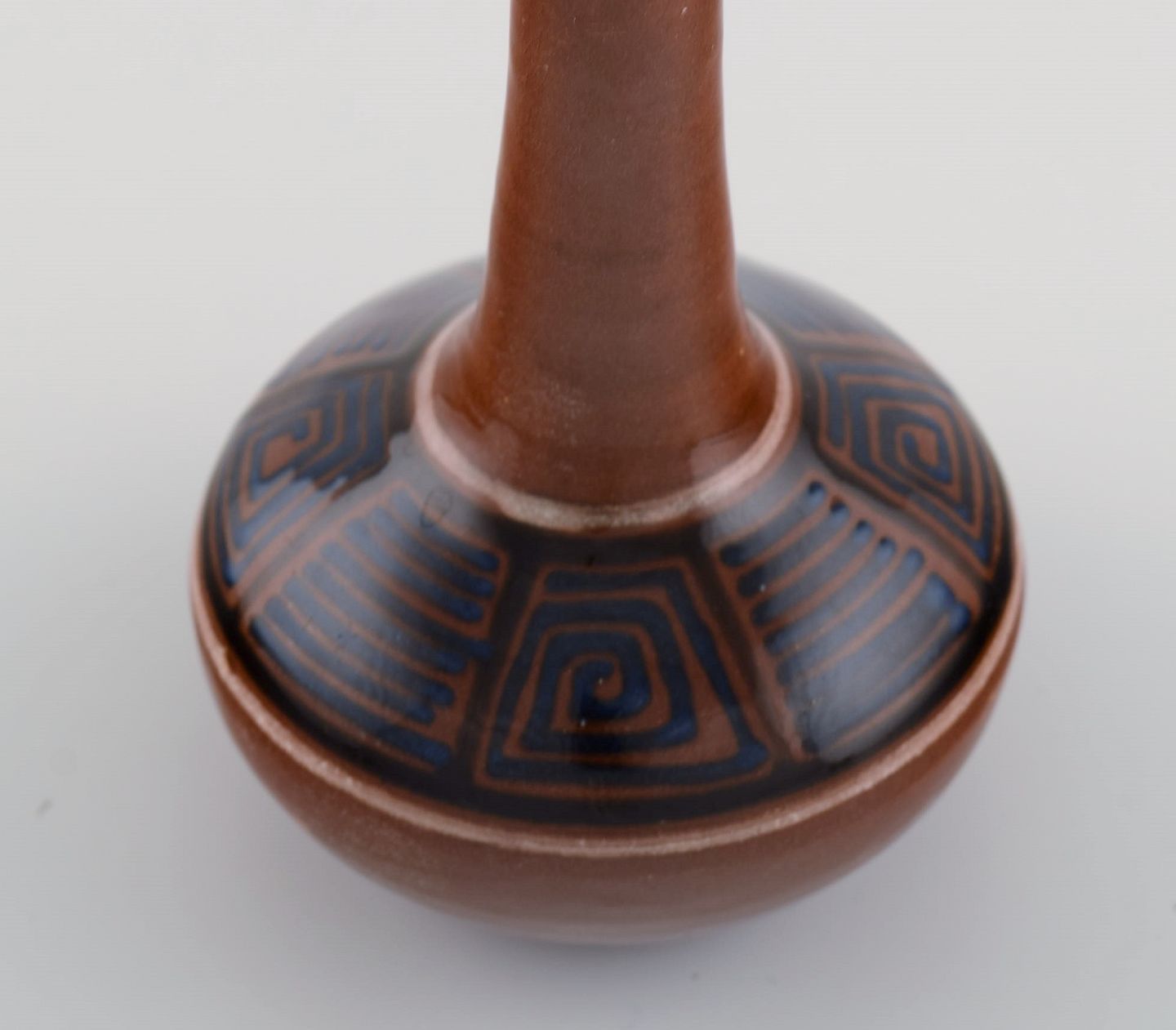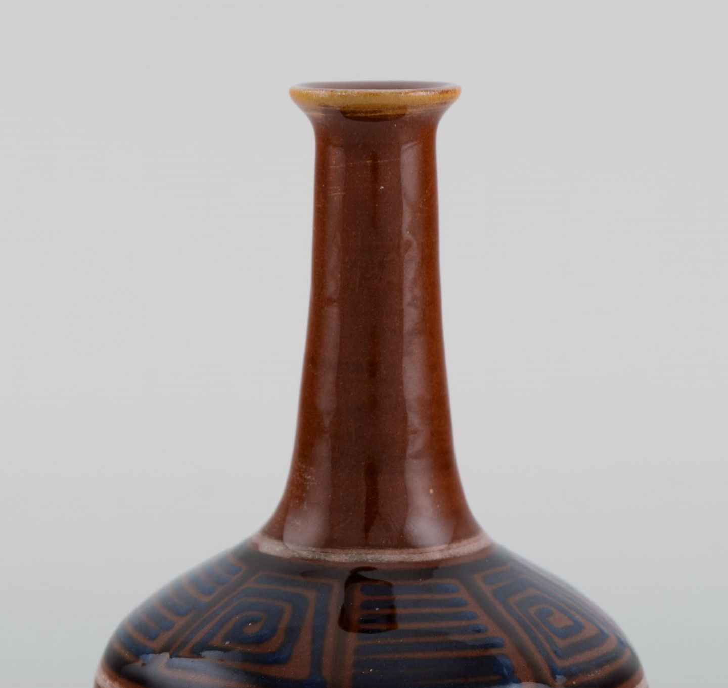 Kähler, HAK. Smalhalset vase i glaseret keramik. Geometrisk mønster på brun baggrund. 1940'erne.