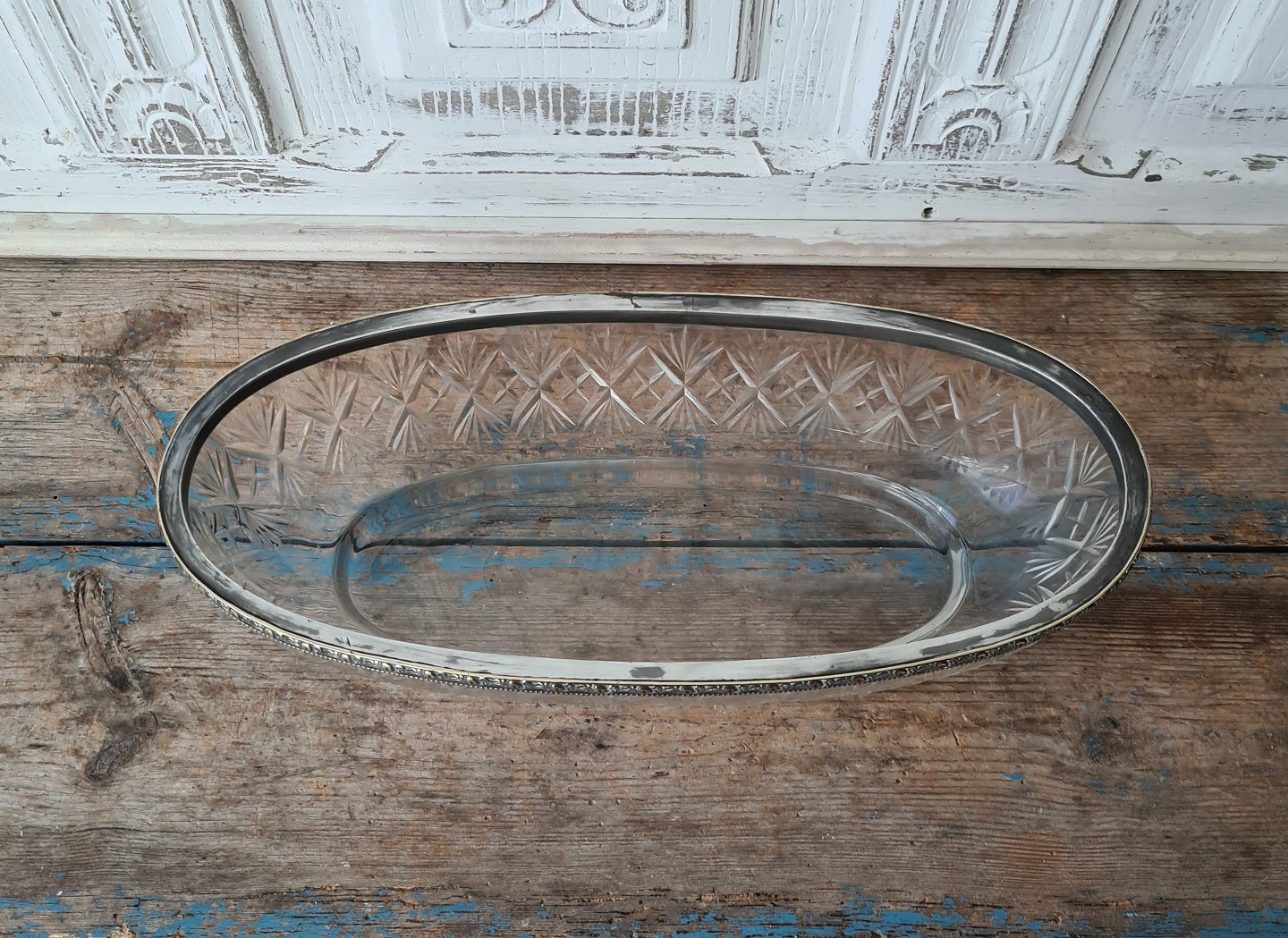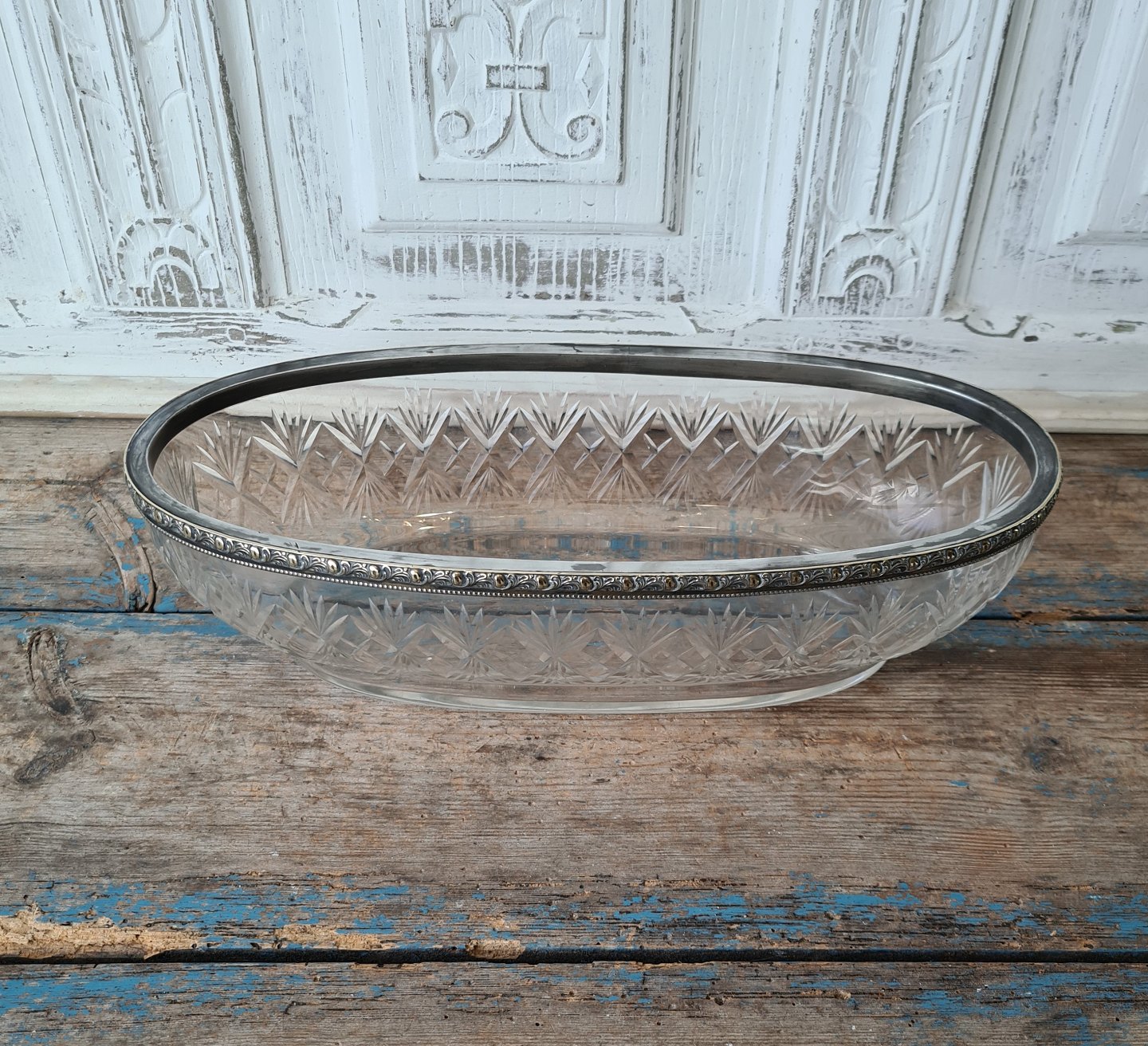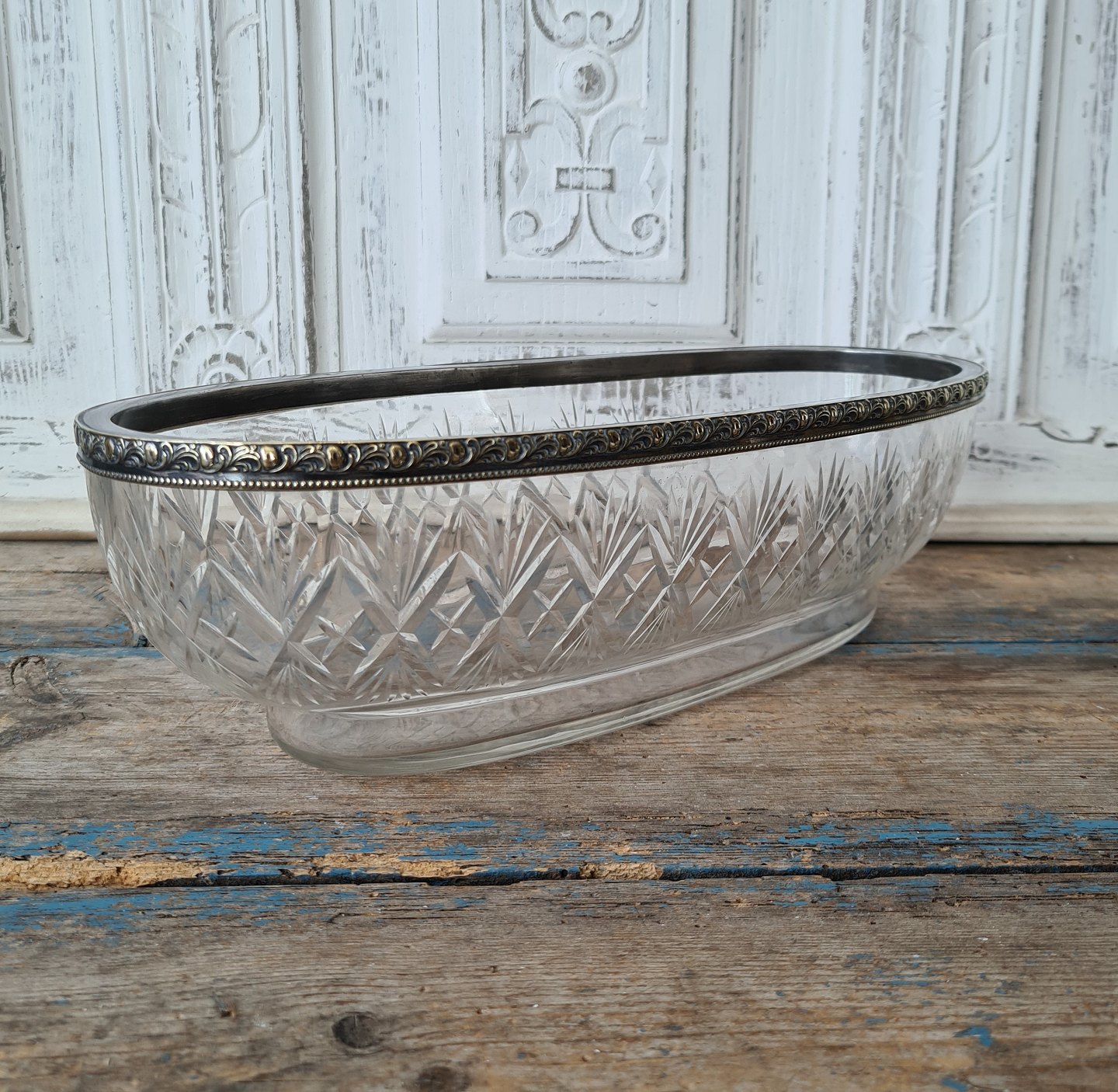 Stor jardiniere af slebet krystal med forsølvet kant