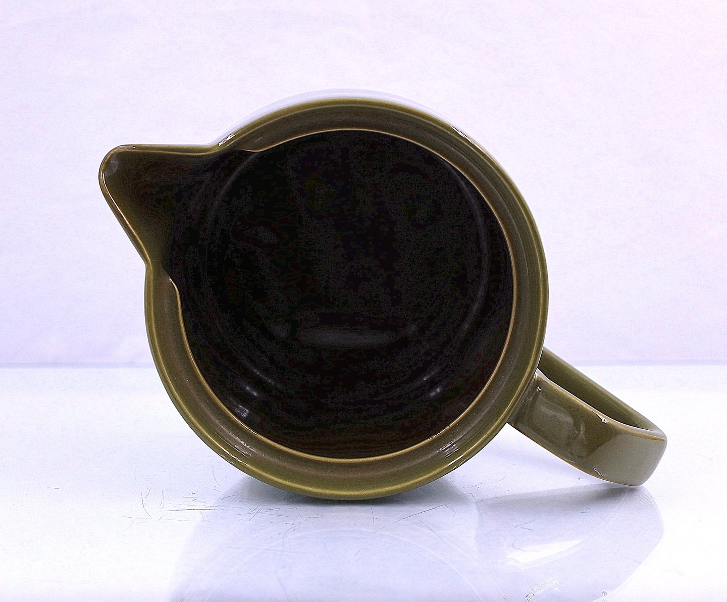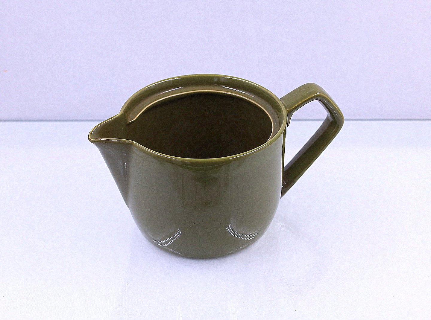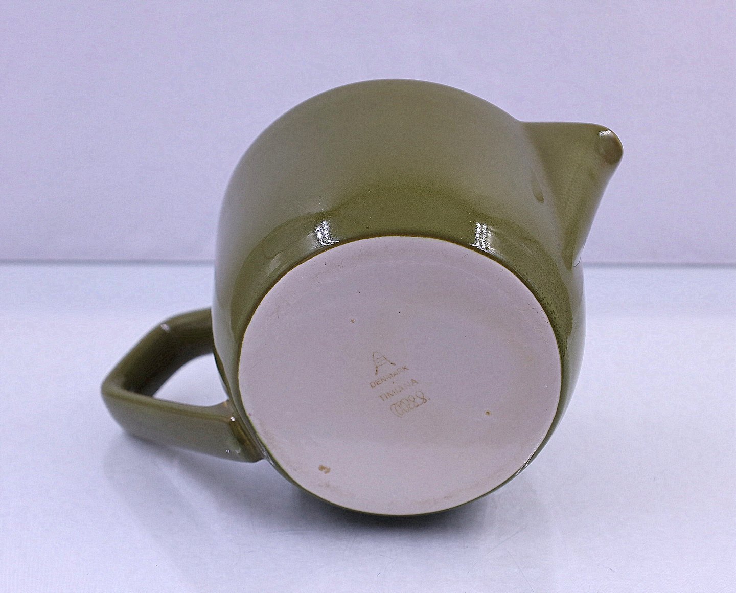 Text available in Danish: Aluminia, Timiana, fajance. Tekande, hel grøn, kan indeholde 0,75 liter. Produceret fra ca. 1960 til 1969.