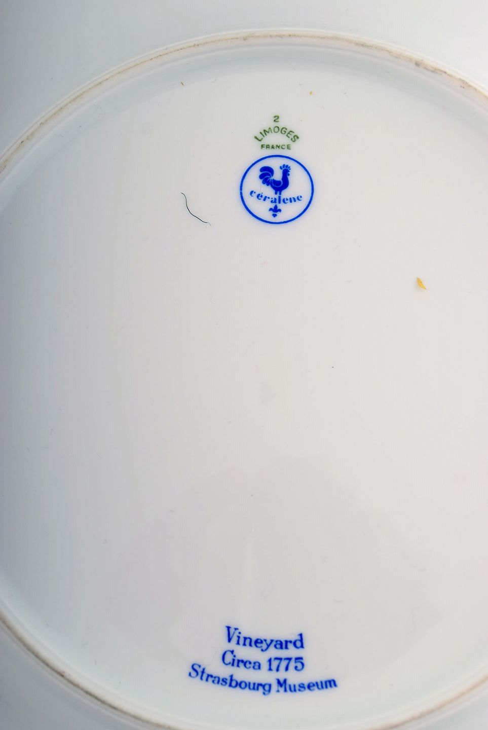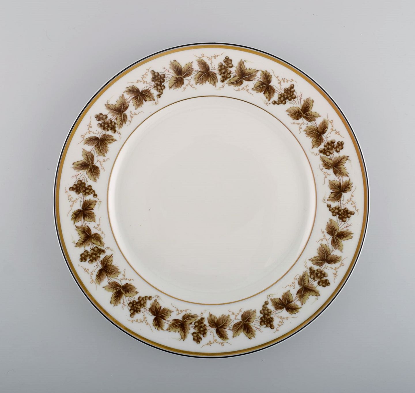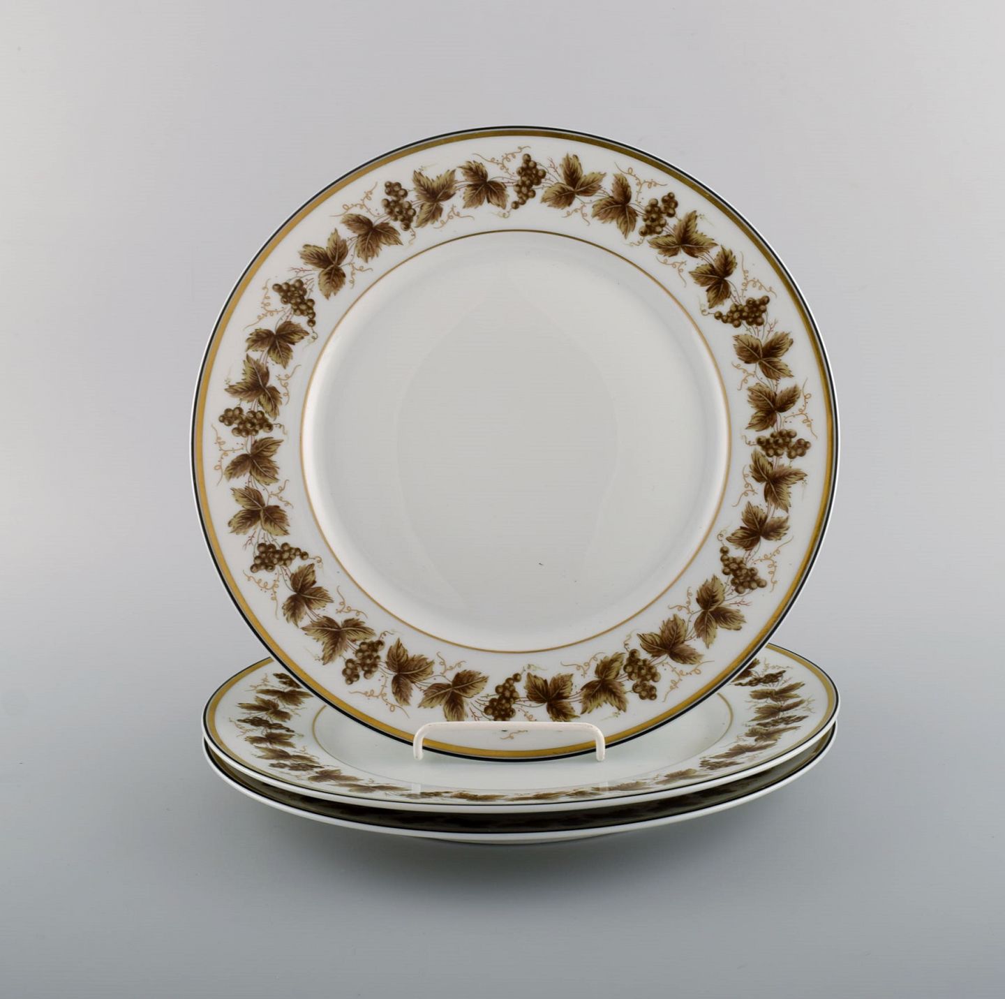 Tre store Limoges tallerkener i porcelæn med håndmalede vindrueranker og gulddekoration. 1930/40'erne.