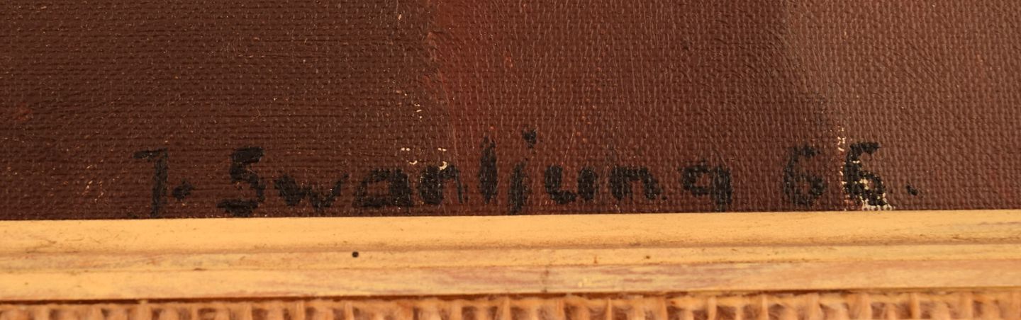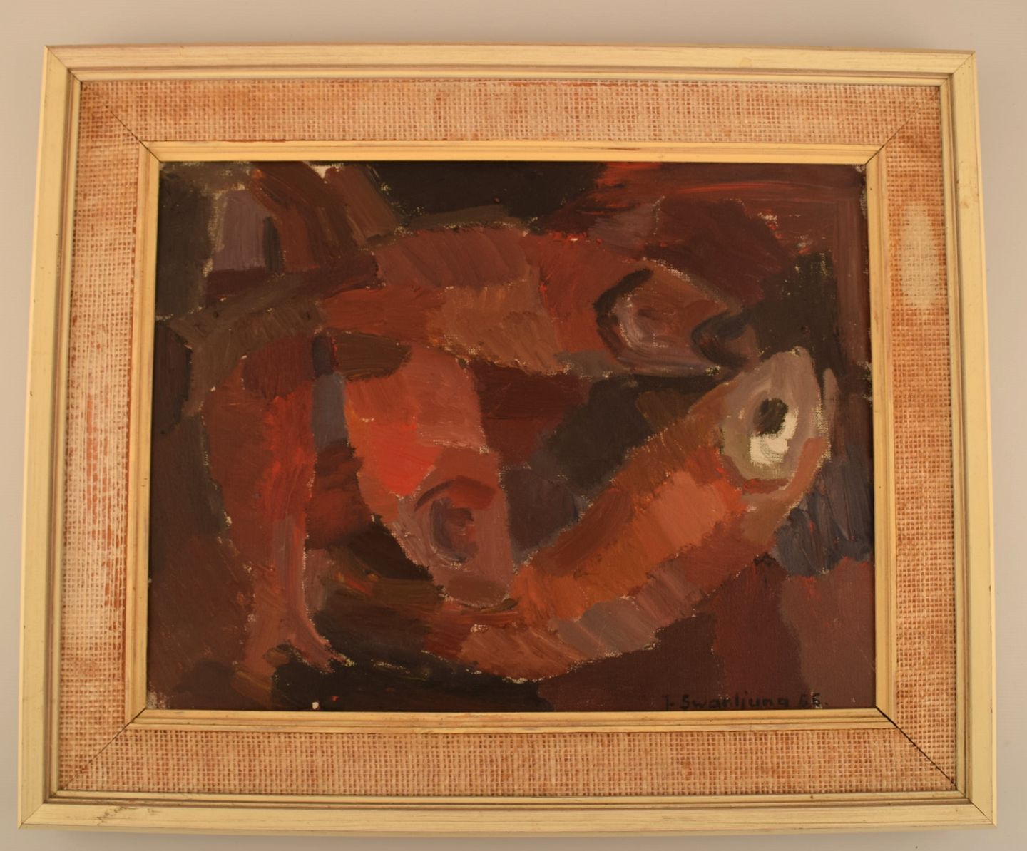 Joyce Swanljung (1910-1977), Sverige. Olie på lærred. Abstrakt maleri med fisk. Dateret 1966.