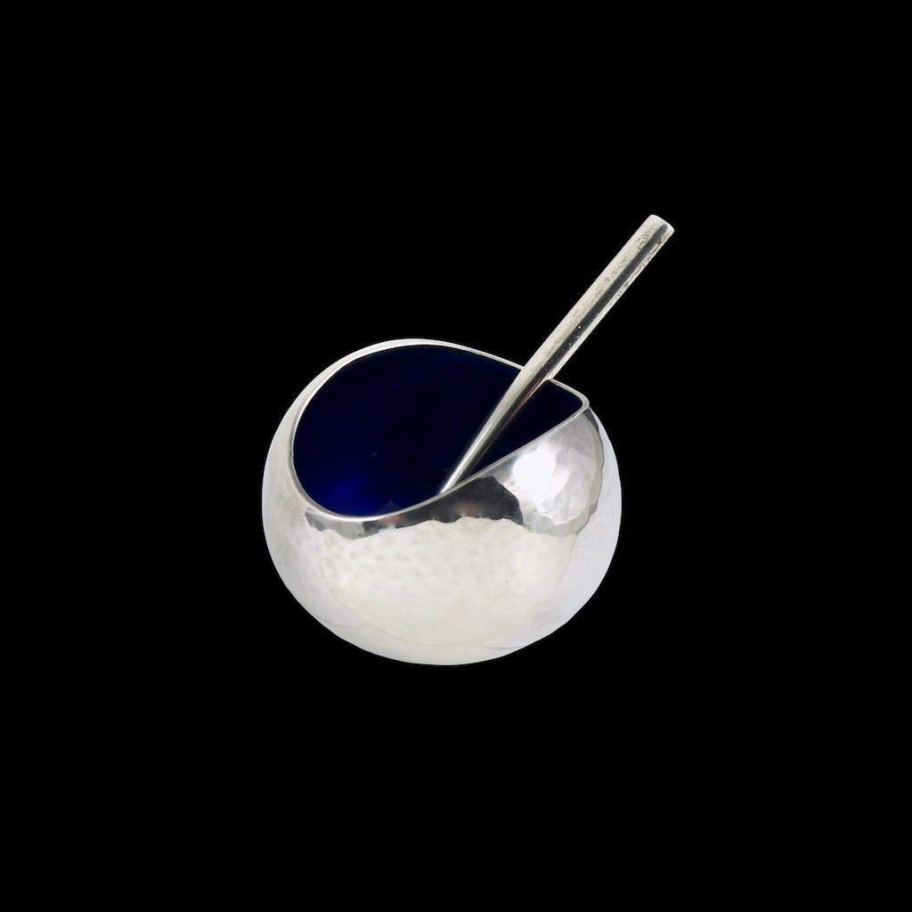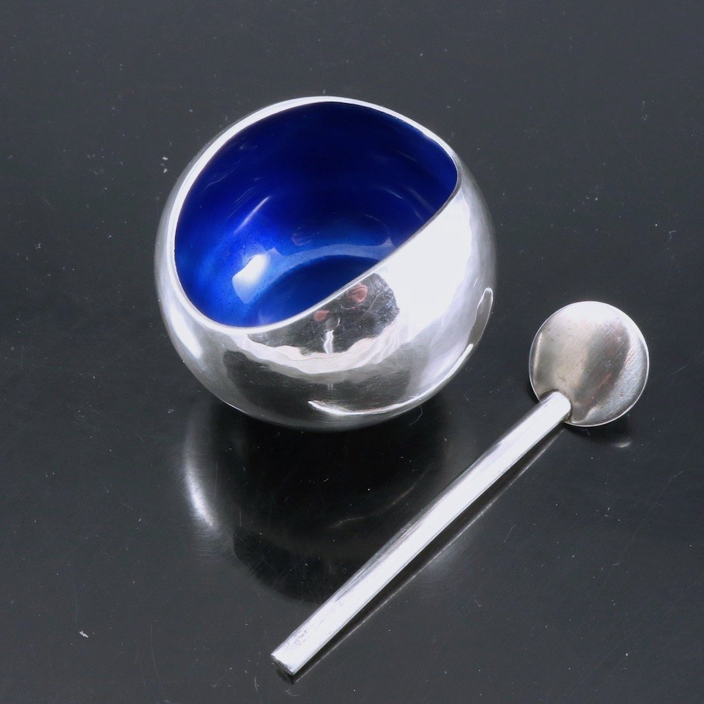 Georg Jensen. Sterling Silver Salt Cellar with blue Enamel and Spoon #1067 - SGJ