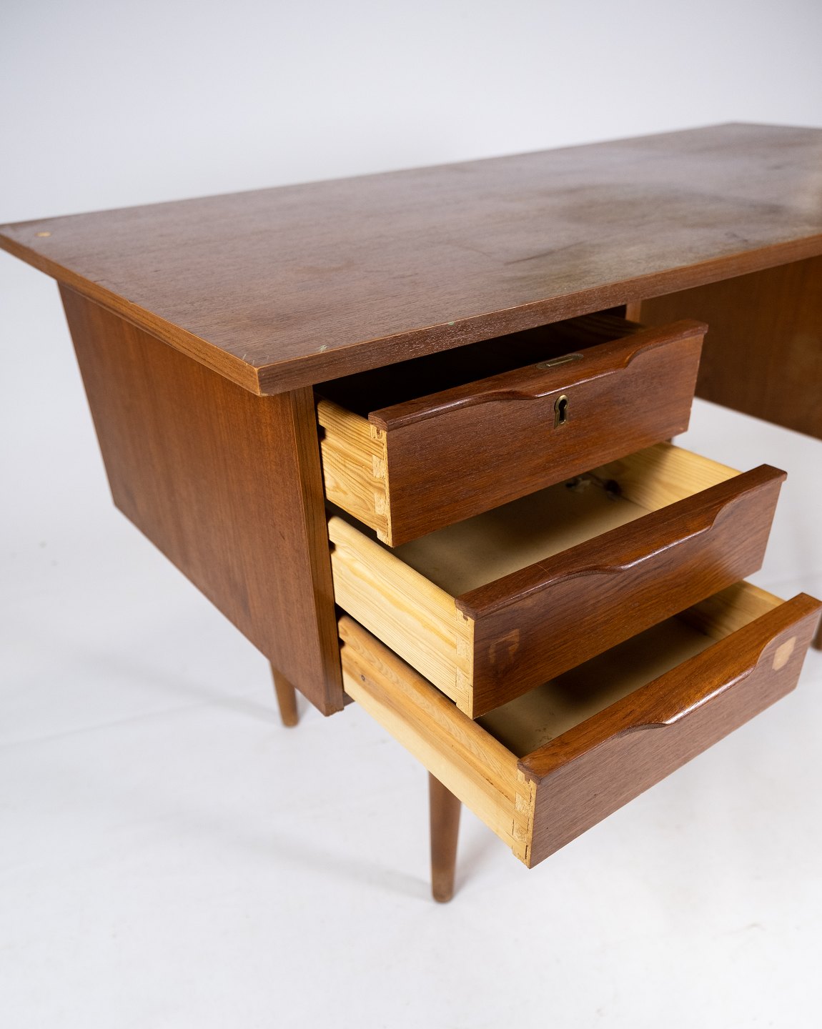 Dette skrivebord er et smukt eksempel på dansk design fra 1960'erne, fremstillet af teaktræ, hvilket giver det et naturligt og tidløst udseende. Den smukke gyldne farve og unikke træmønster tilføjer karakter og varme til ethvert rum. Med sit enkle og elegante design passer skrivebordet sømløst ind i både moderne og klassiske indretninger.