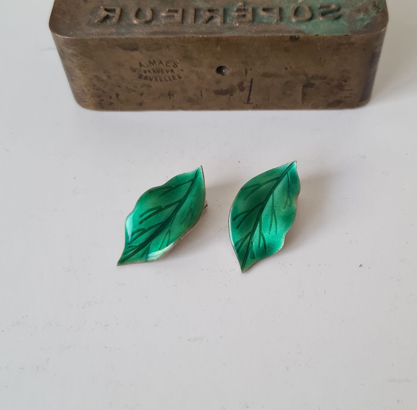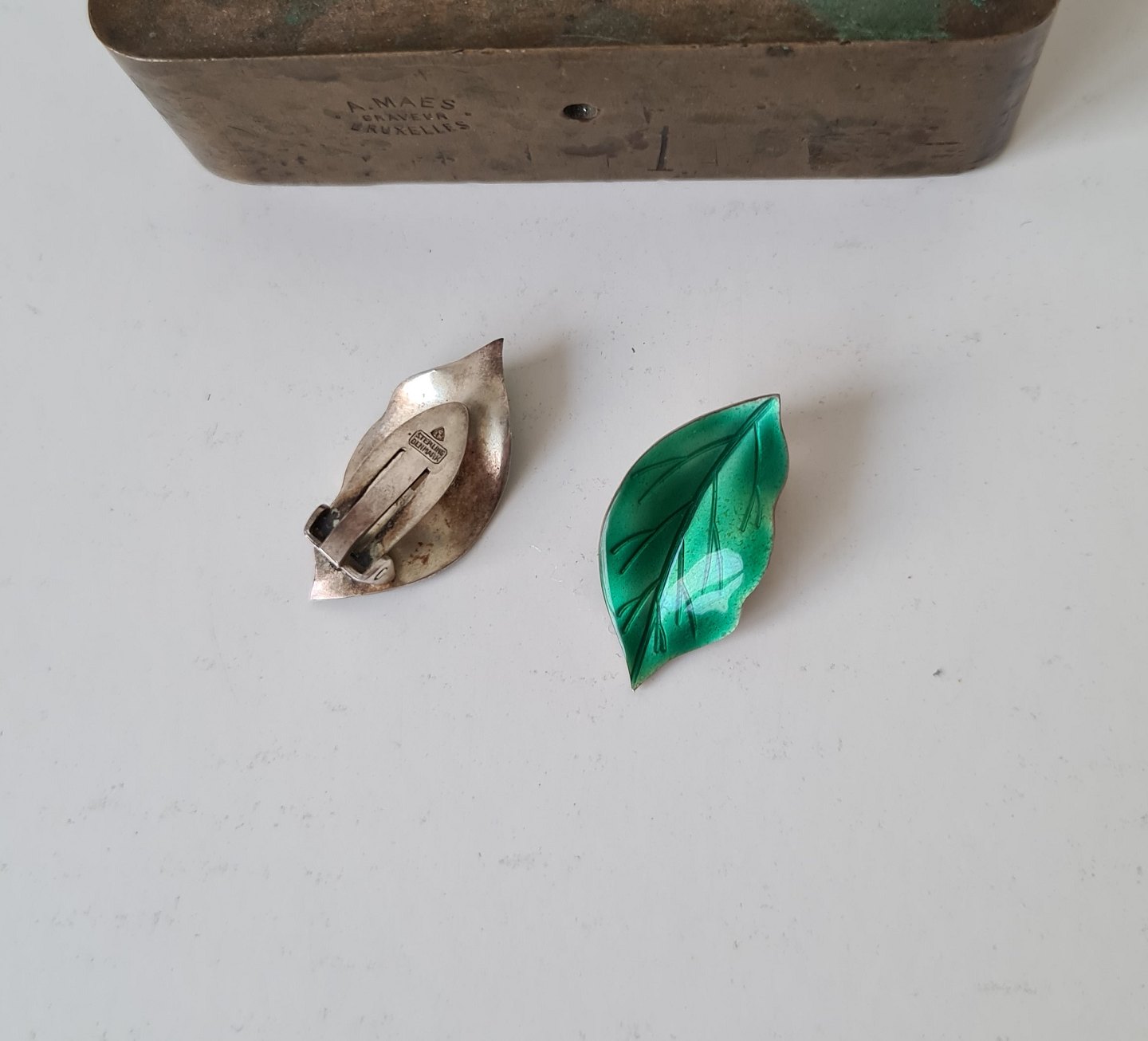 A.Michelsen øreklips formet som blade, udført i sterlingsølv og grøn emalje