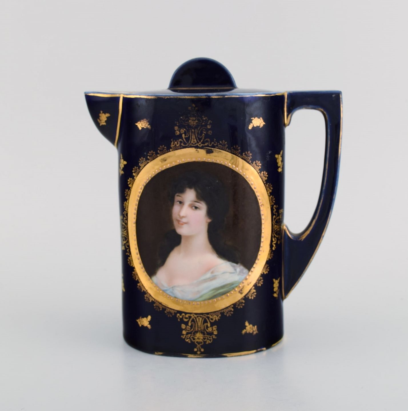 Antikt kaffeservice i håndmalet porcelæn med motiver af unge kvinder i profil og gulddekoration. Wien, sent 1800-tallet.