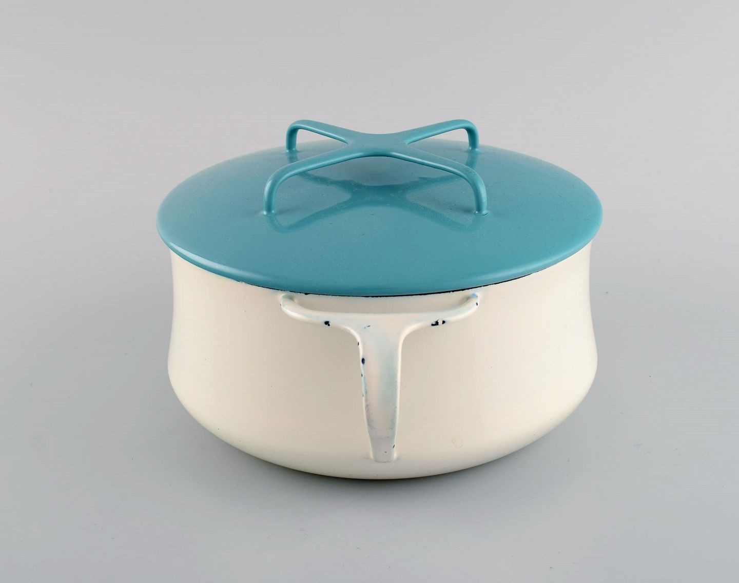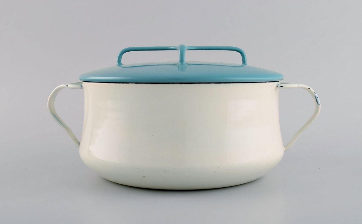 Jens H. Quistgaard: Gryde med låg i turkis og cremefarvet emalje.