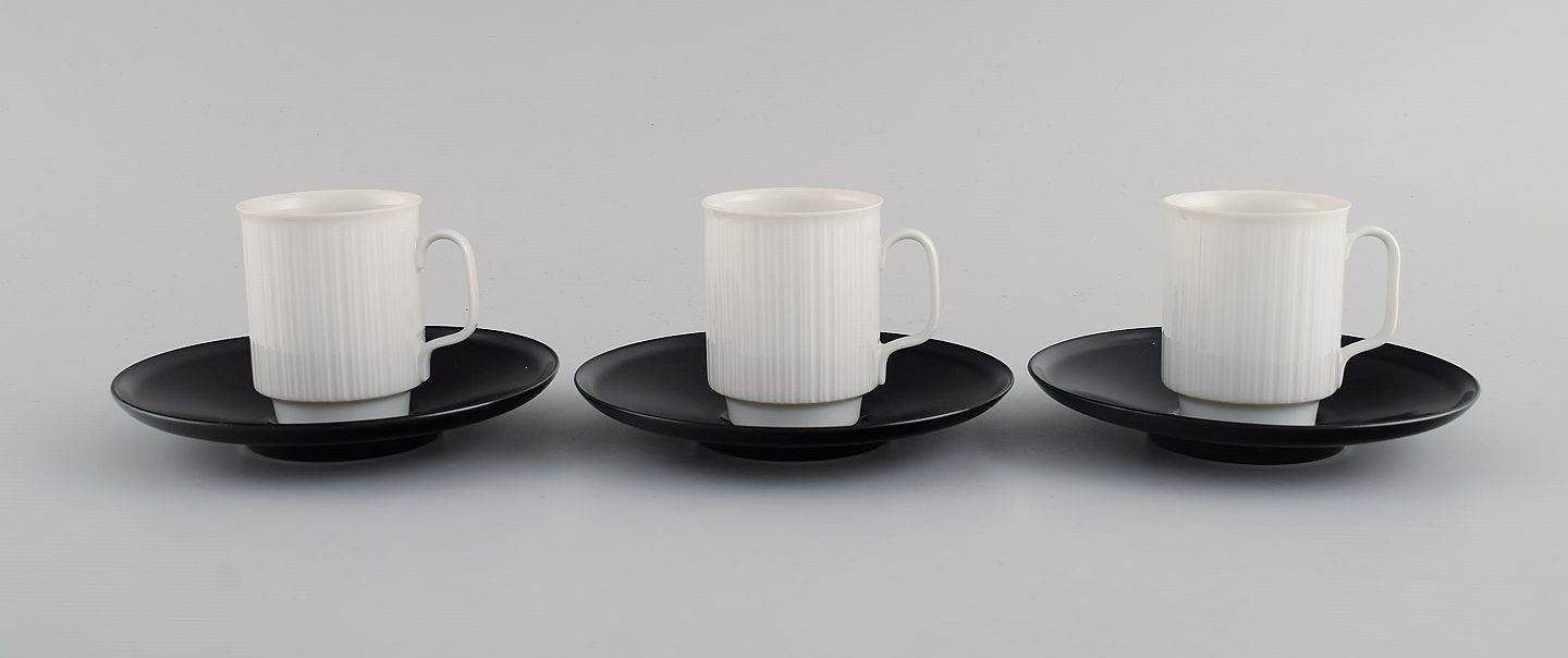 Tapio Wirkkala for Rosenthal. Tre porcelaine noire mokkakopper med underkopper i sort / hvidt riflet porcelæn. 1980'erne.