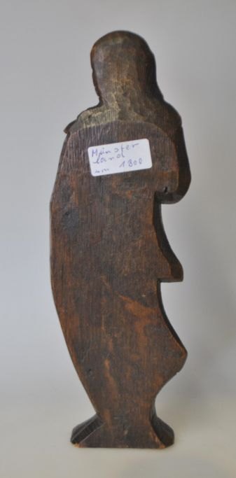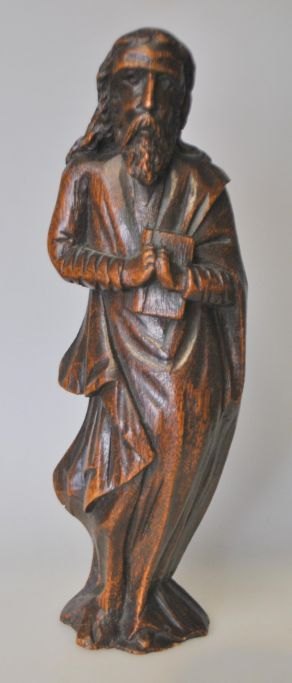Udskåret religiøs træfigur, En apostel holdende en bog, Egetræ, ca. 1800, Tyskland.  Højde.: 29,5 cm.  Fra Münsterland området.