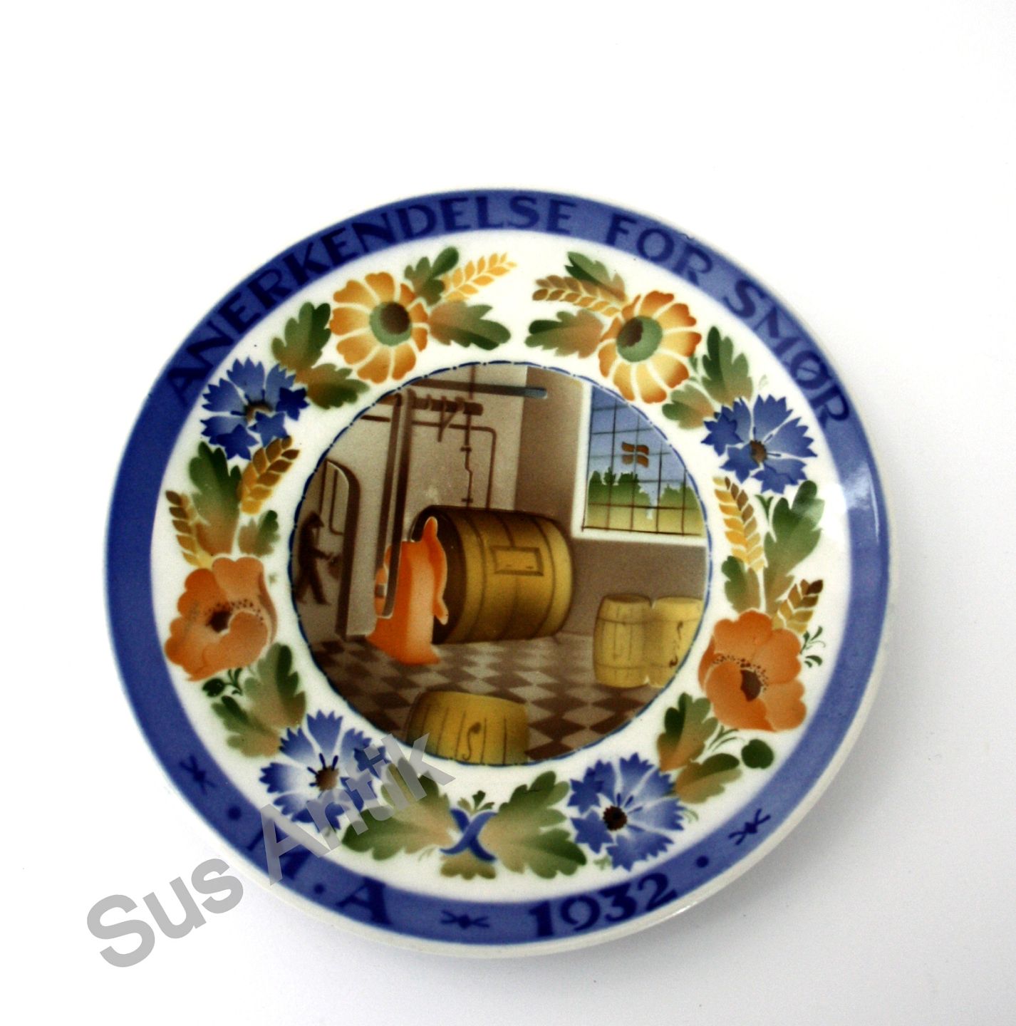 Aluminia, Mejeriplatte, Anerkendelse for velbehandlet smør. Maribo Amts Kreds 1932. Stemplet Kjøbenhavns Fajancefabrik Danmark. Luftmalet dekoration efter tegning af Oscar Willerup.