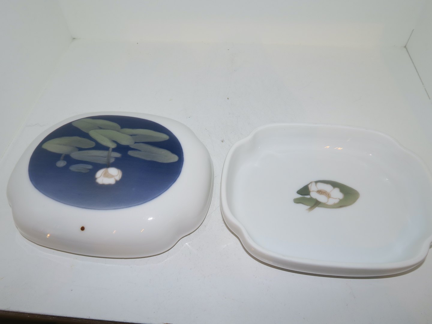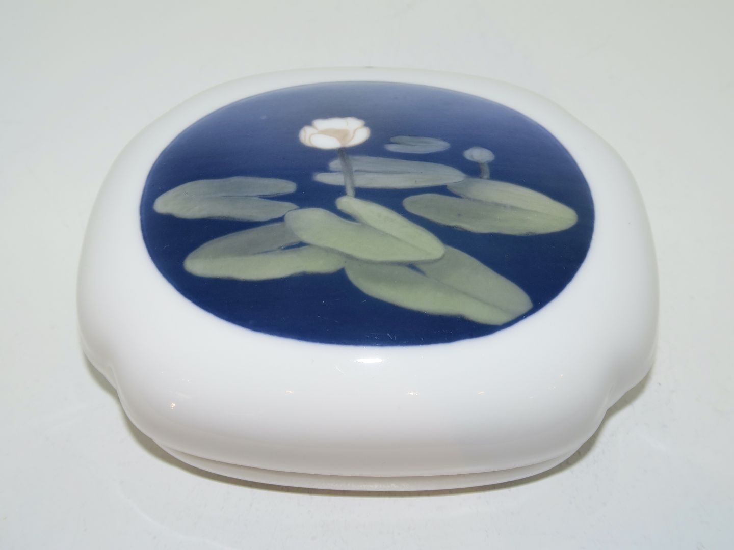 Royal Copenhagen Art Nouveau skål med låg. Dekoreret med åkander på låg og indersiden.