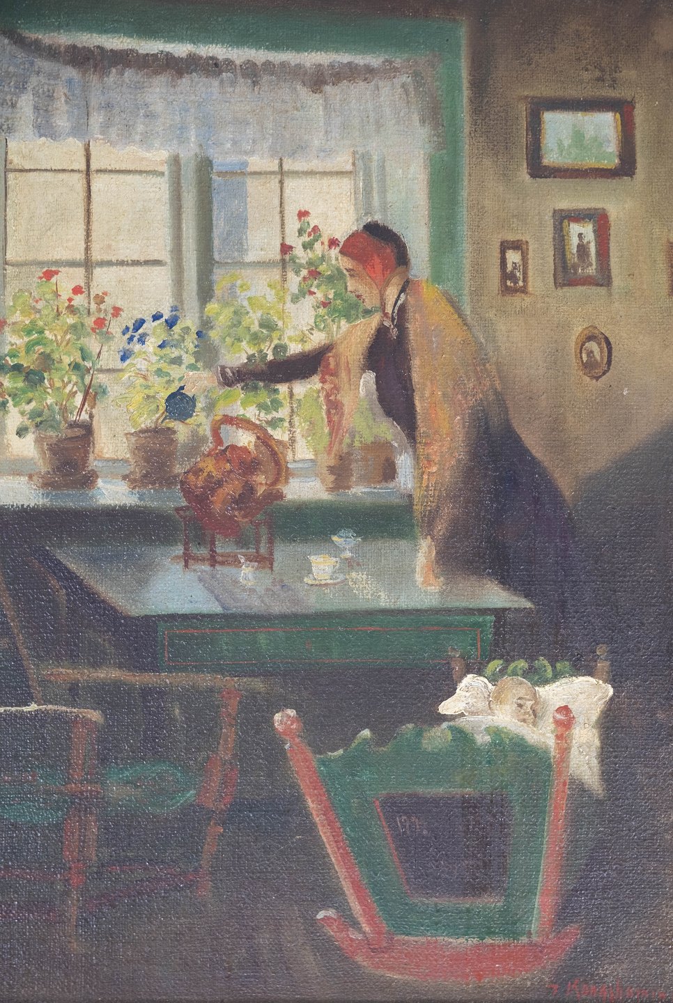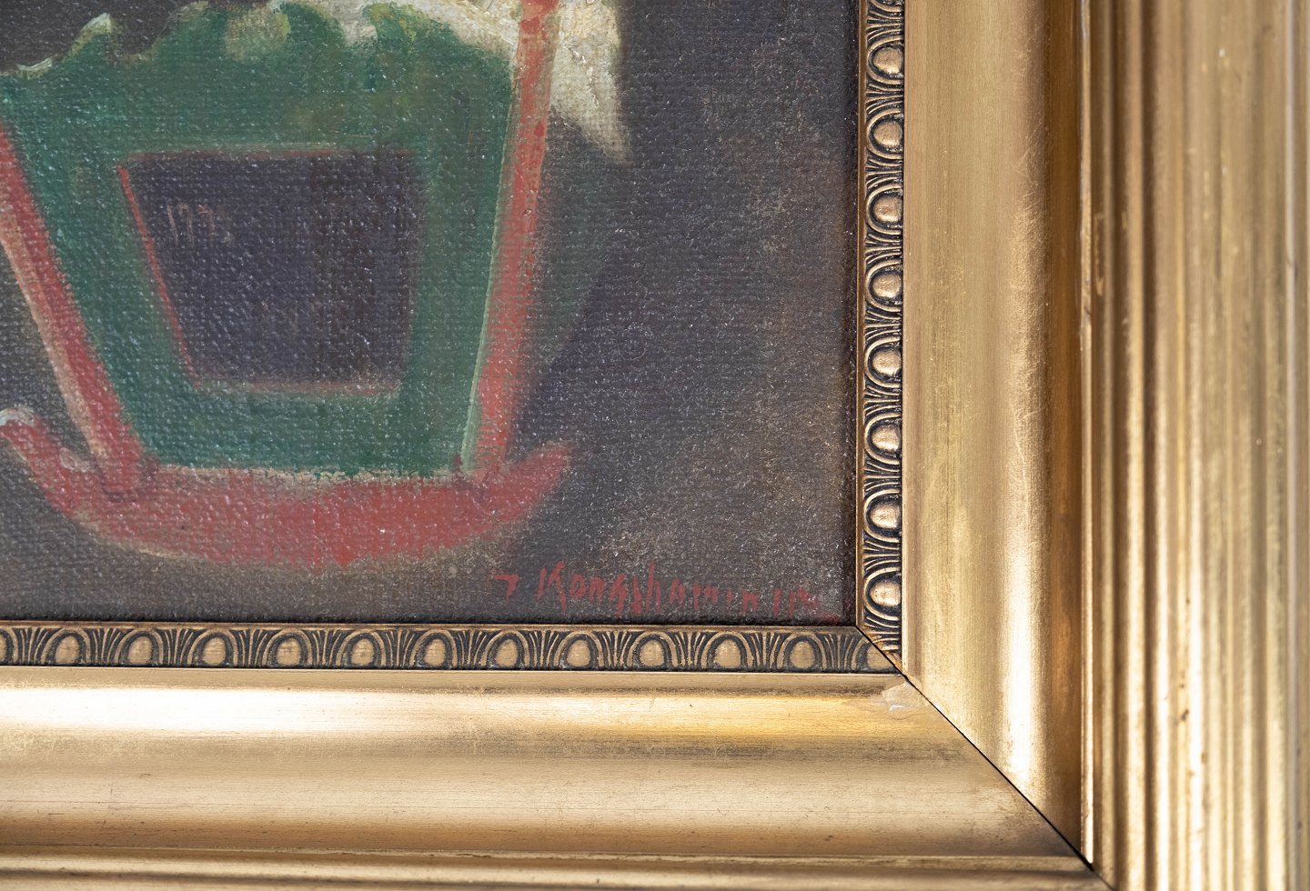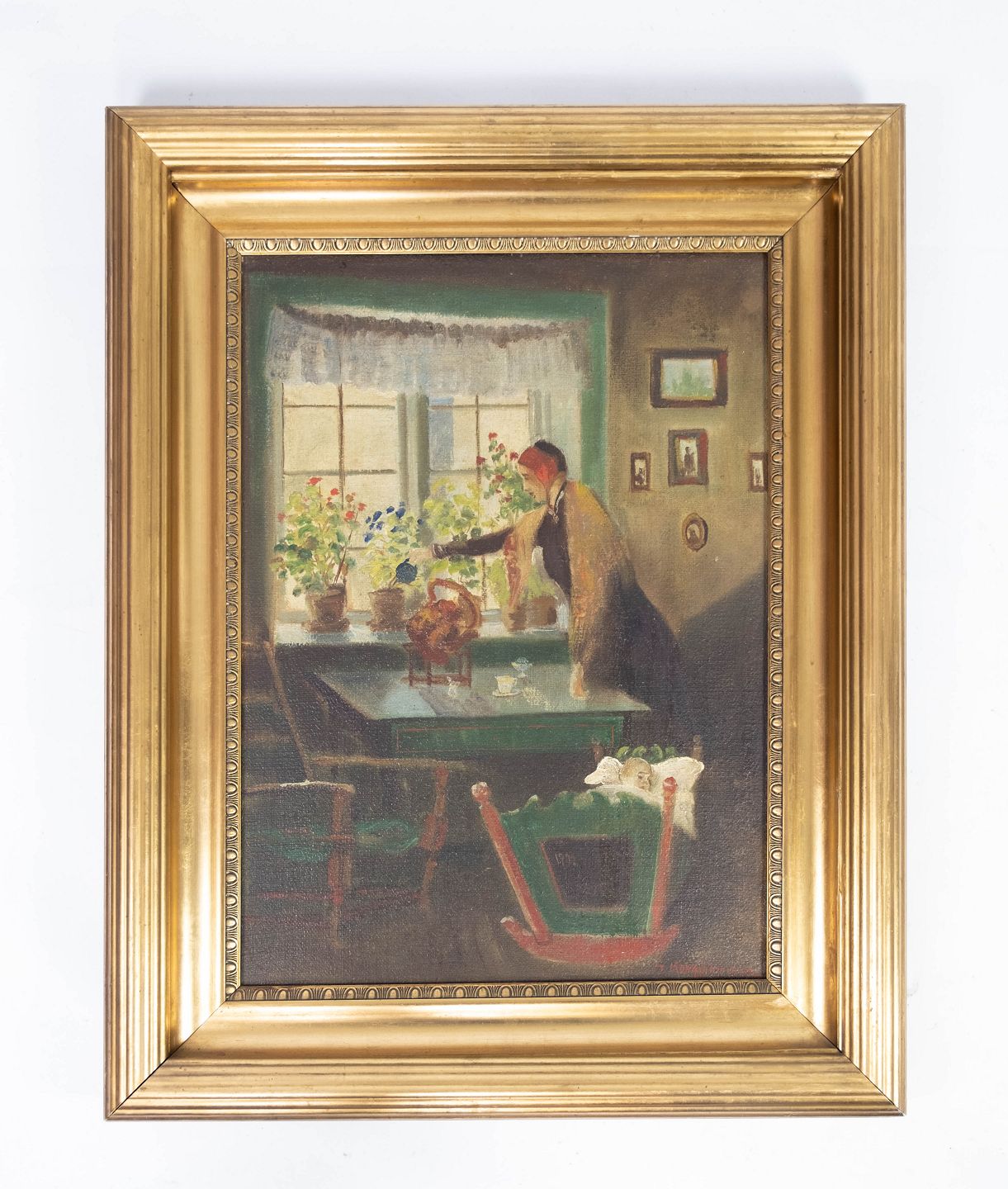 Oliemaleri med motiv af et hjem og med forgyldt ramme, malet af Jens Konghammer (1884-1974) fra 1920erne.