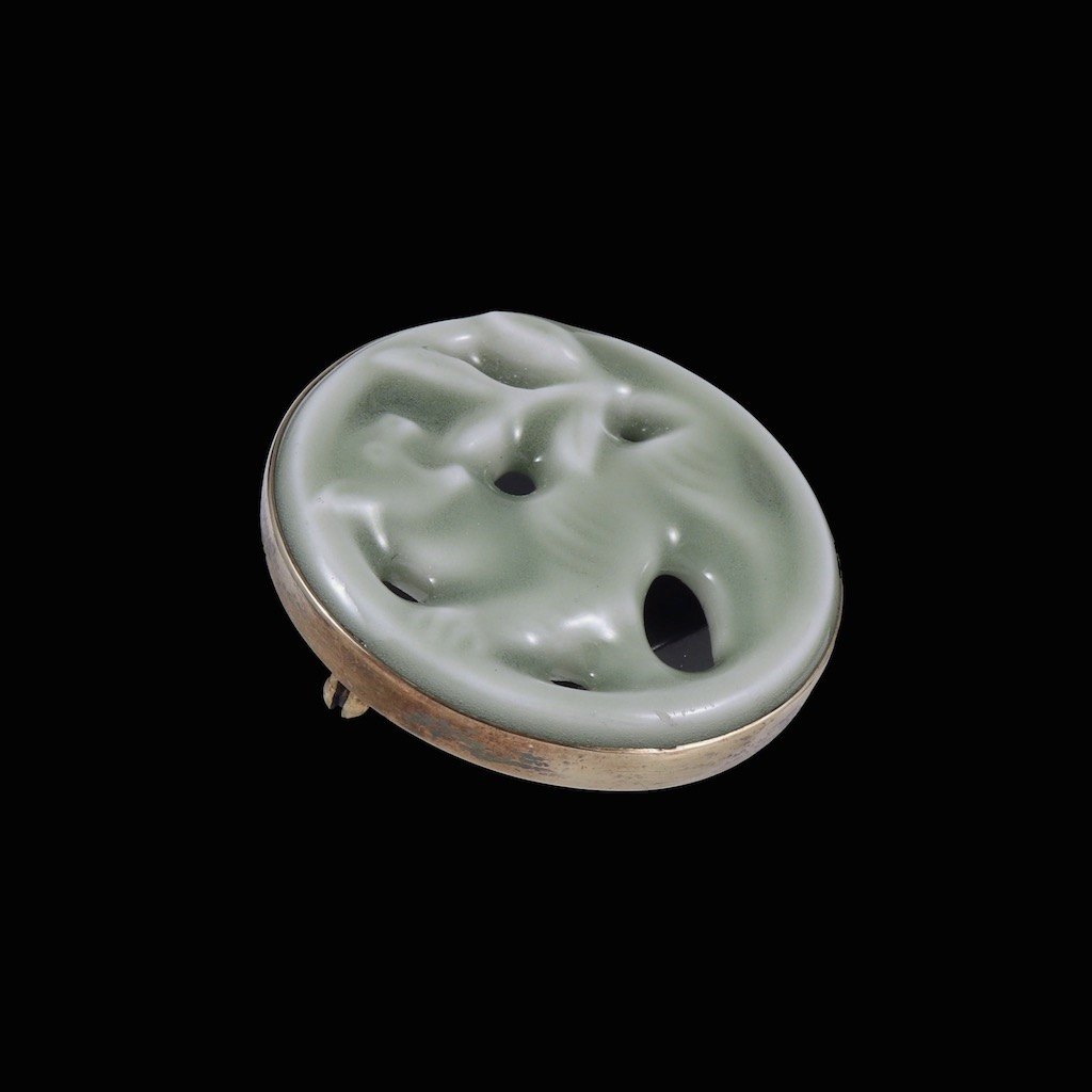 Jais Nielsen 1885-1961. Ceramic Brooch with Celadon glace and gilded silver mounting.