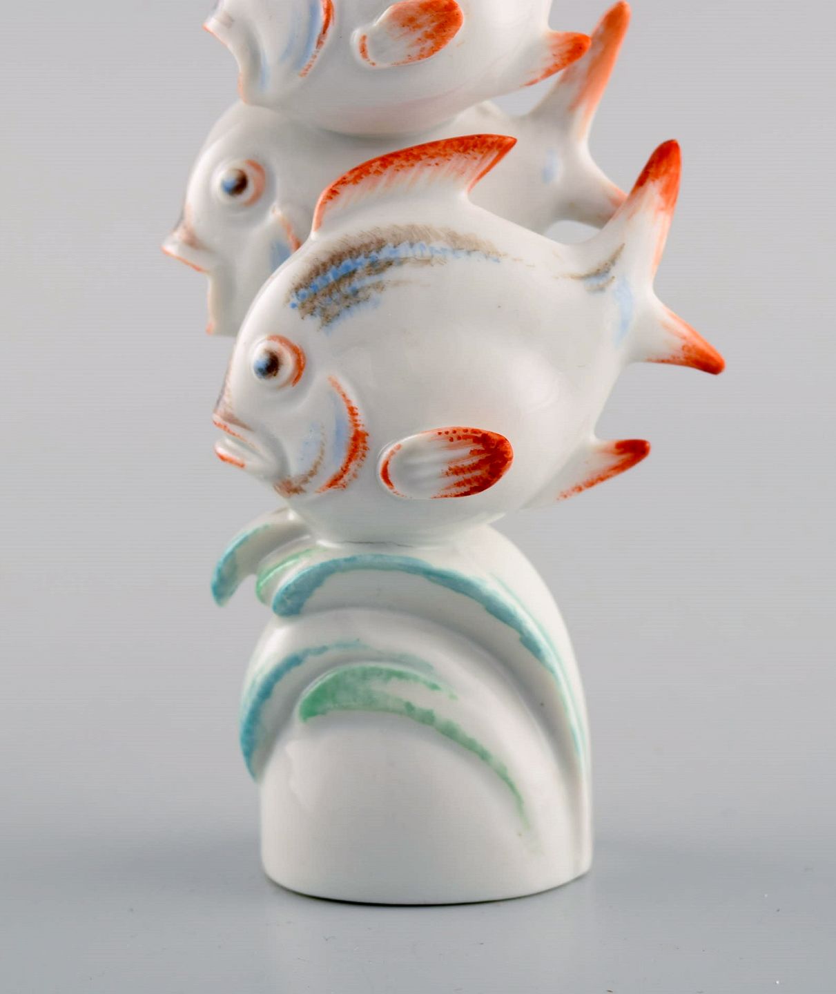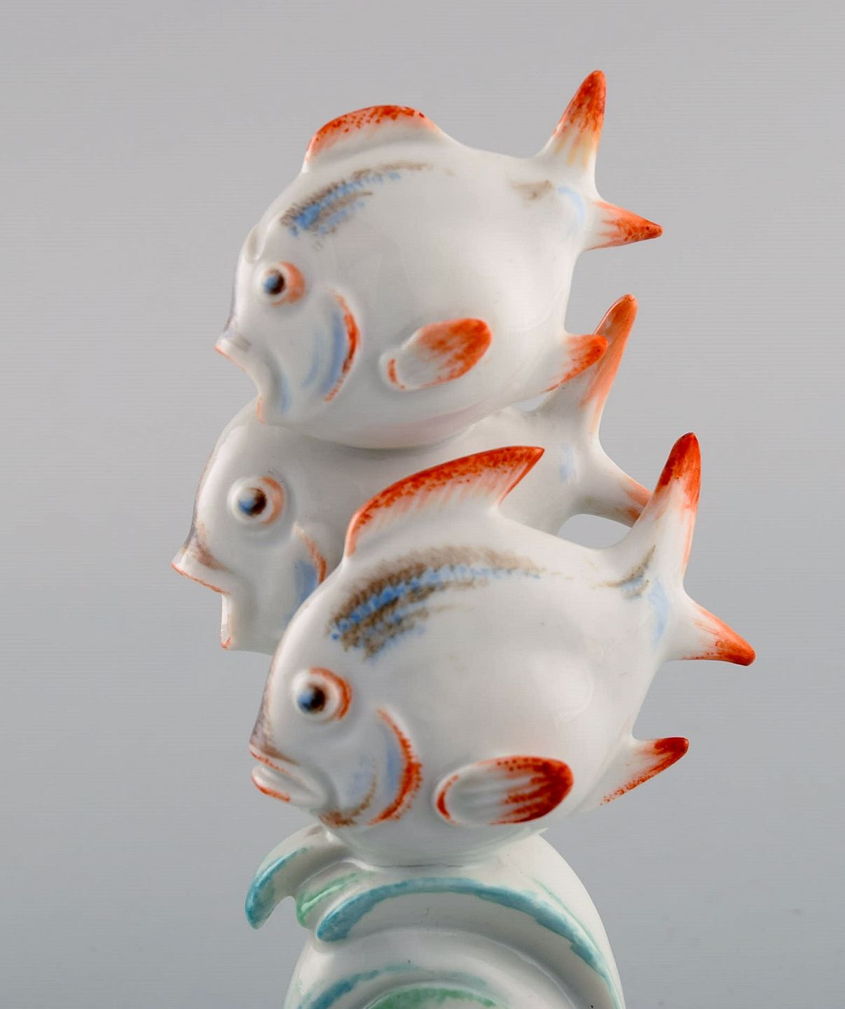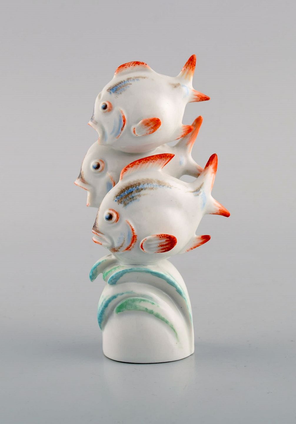 Willi Münch-Khe (1885-1960) for Meissen. Art deco figur i håndmalet porcelæn. Tre fisk. 1930'erne.