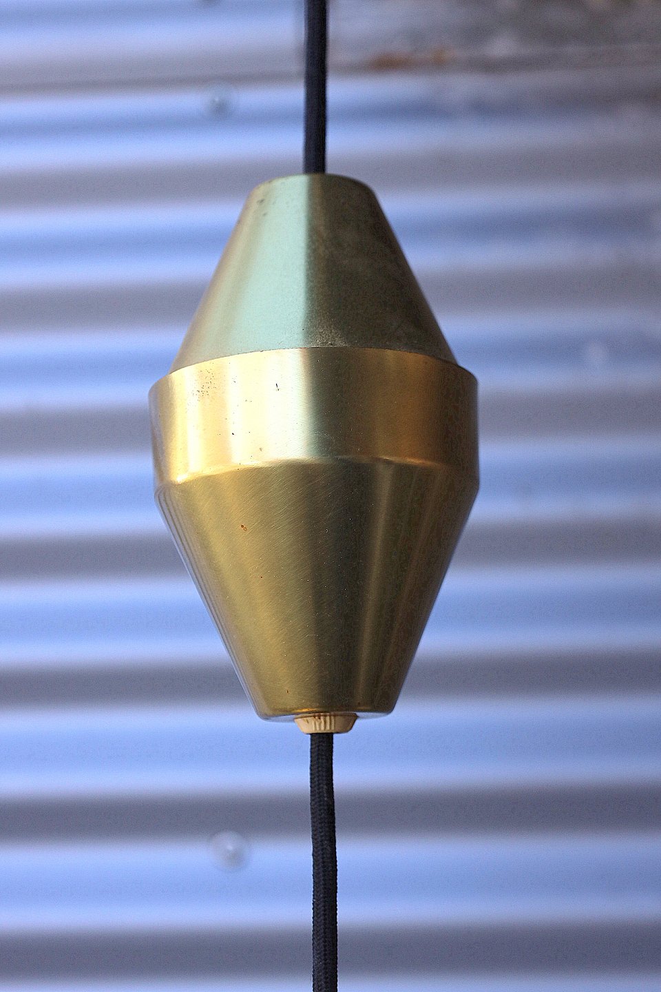 Lyfa. Fritz Schlegel for Lyfa. Retro pendel med hejs. Pendlen er af lakeret messing og mat, hvid lakeret indvendig. Hejse funktion og baldakin er også af messing. Model P295