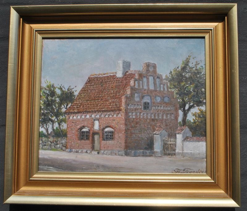 Frandsen, Frands (1885 - 1979) Danmark: Den gamle Latinskole i Skælskør. Olie på masonit. Signeret. 21 x 26 cm.