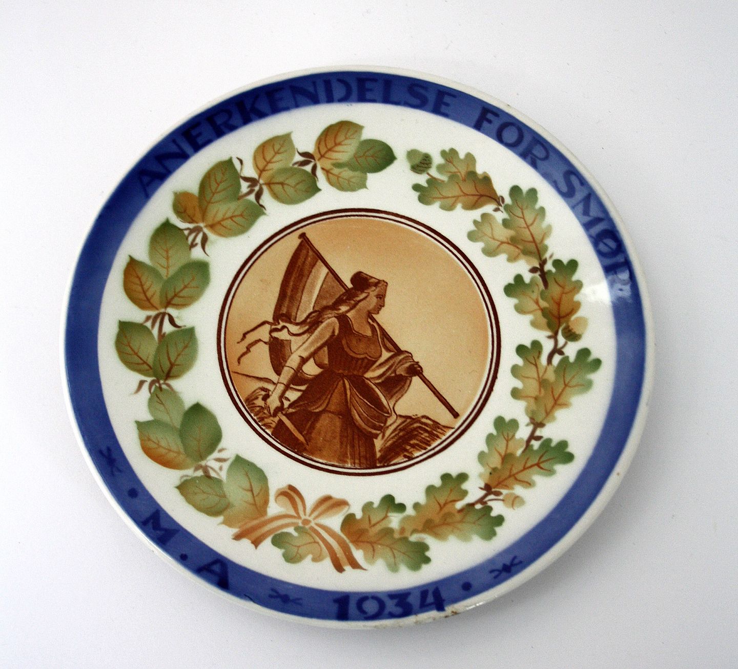 Aluminia. Mejeriplatte, Anerkendelse for velbehandlet smør. Maribo Amts Kreds 1934. Luftmalet dekoration efter tegning af Oscar Willerup.