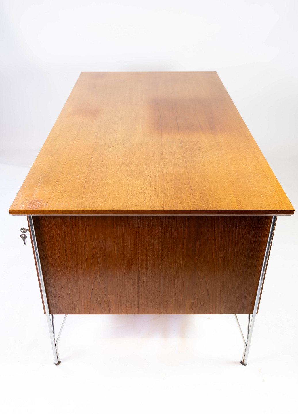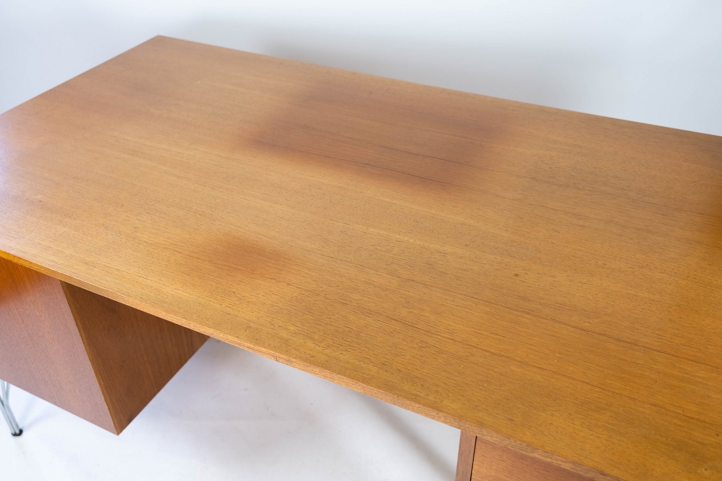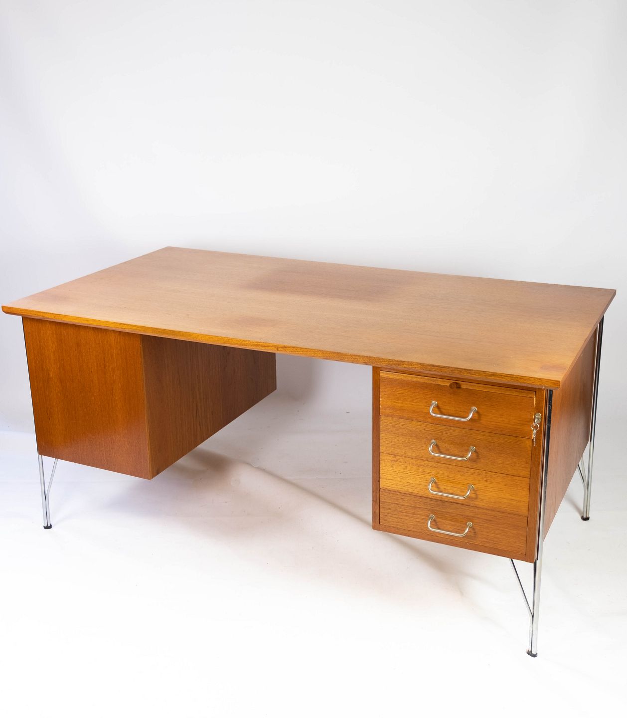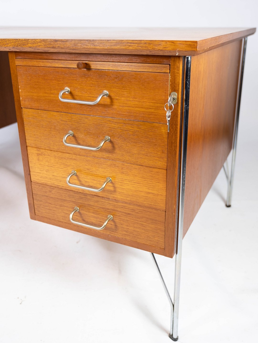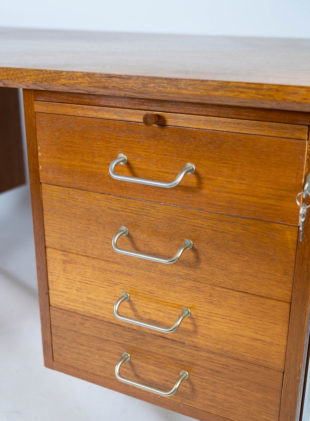 Dette skrivebord er et eksempel på dansk design fra 1970'erne og er fremstillet af teaktræ, hvilket giver det et naturligt og tidløst udseende. Den varme farve og de karakteristiske træmønstre tilføjer en unik æstetik til rummet. Skrivebordet har et enkelt og elegant design, der passer godt ind i både moderne og klassiske indretninger.
