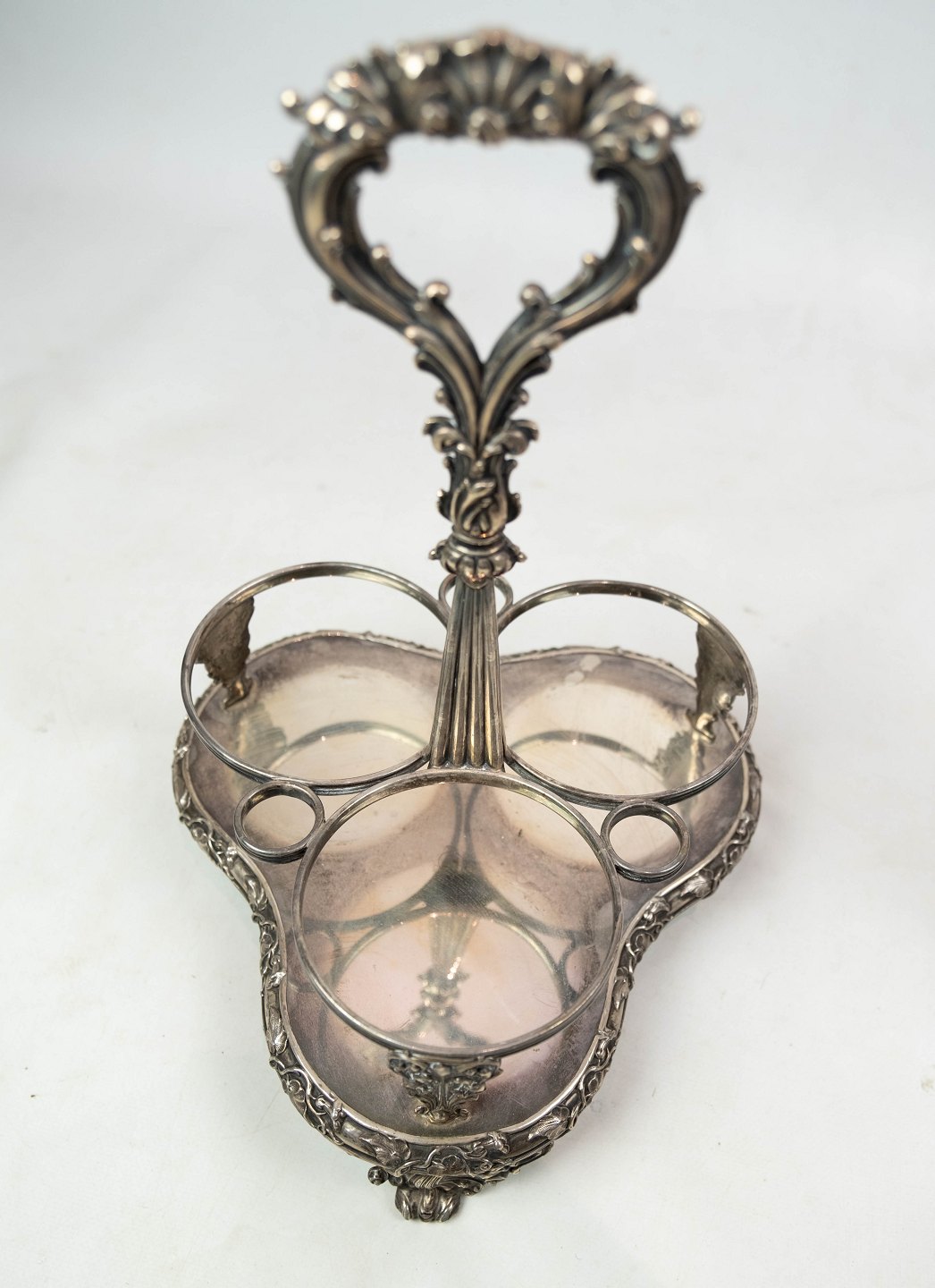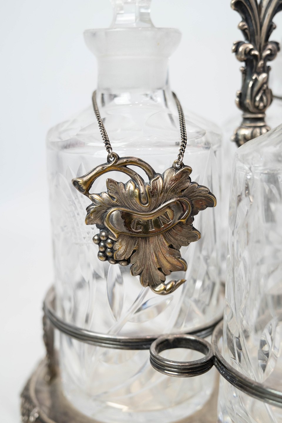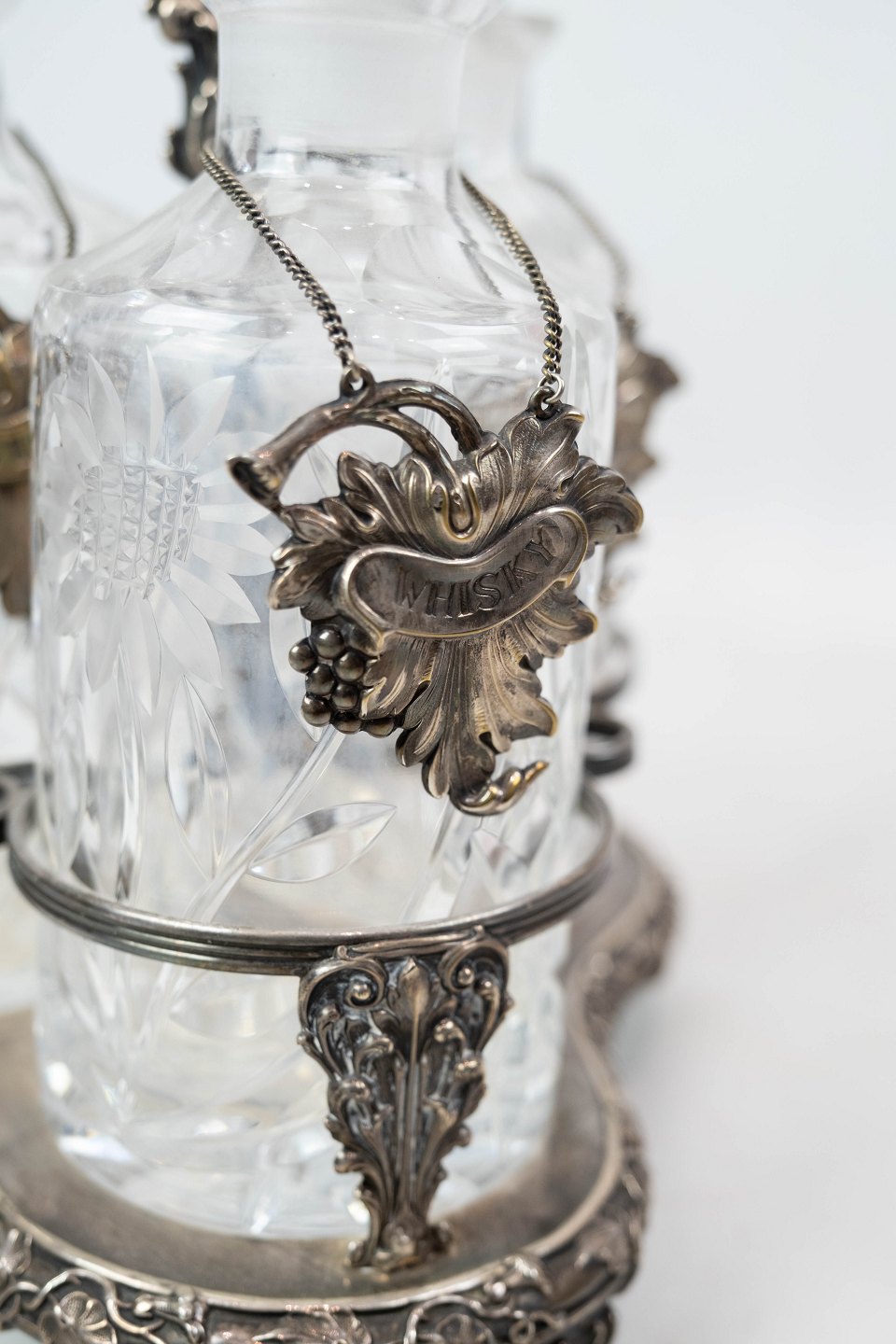 Forsølvet tantalus med sæt af tre karafler, i flot antik stand fra 1880.