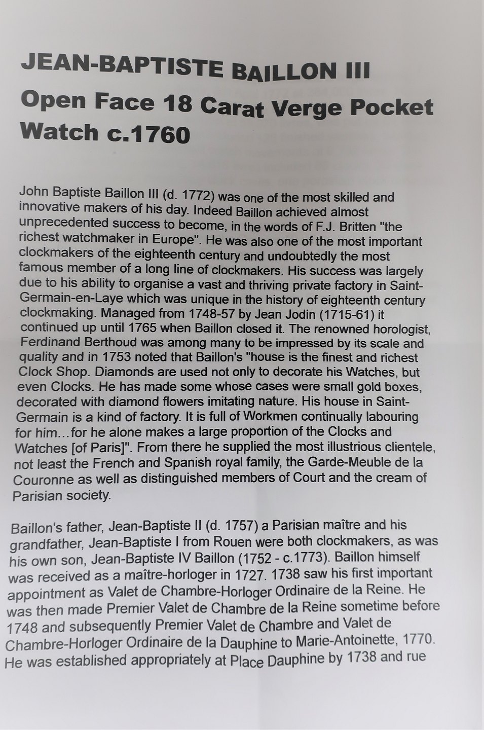 Lommeur i guld 18K (750 ). Jean-Baptiste Baillon III, Paris. Værk nummer 2872 . Diameter 45 mm. Produceret ca. 1760. Uret virker.