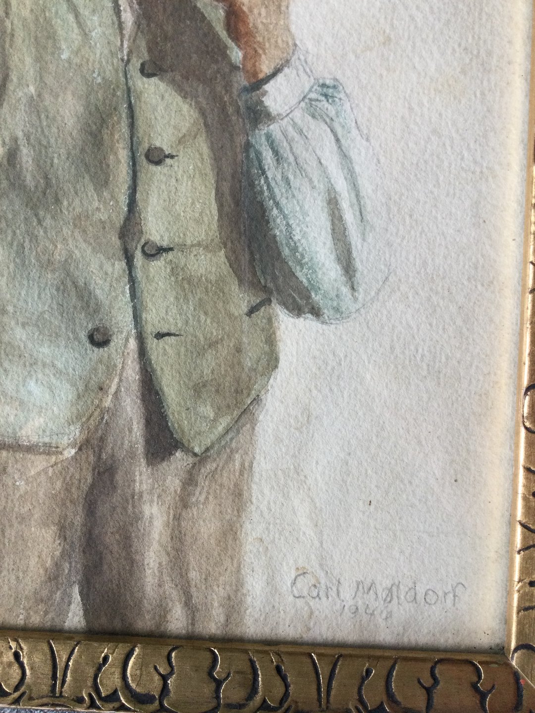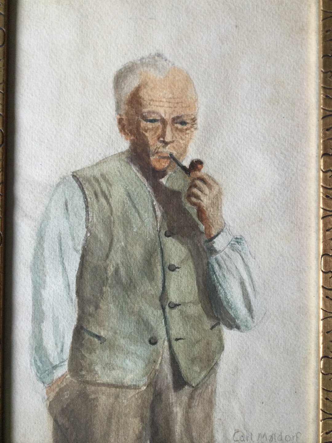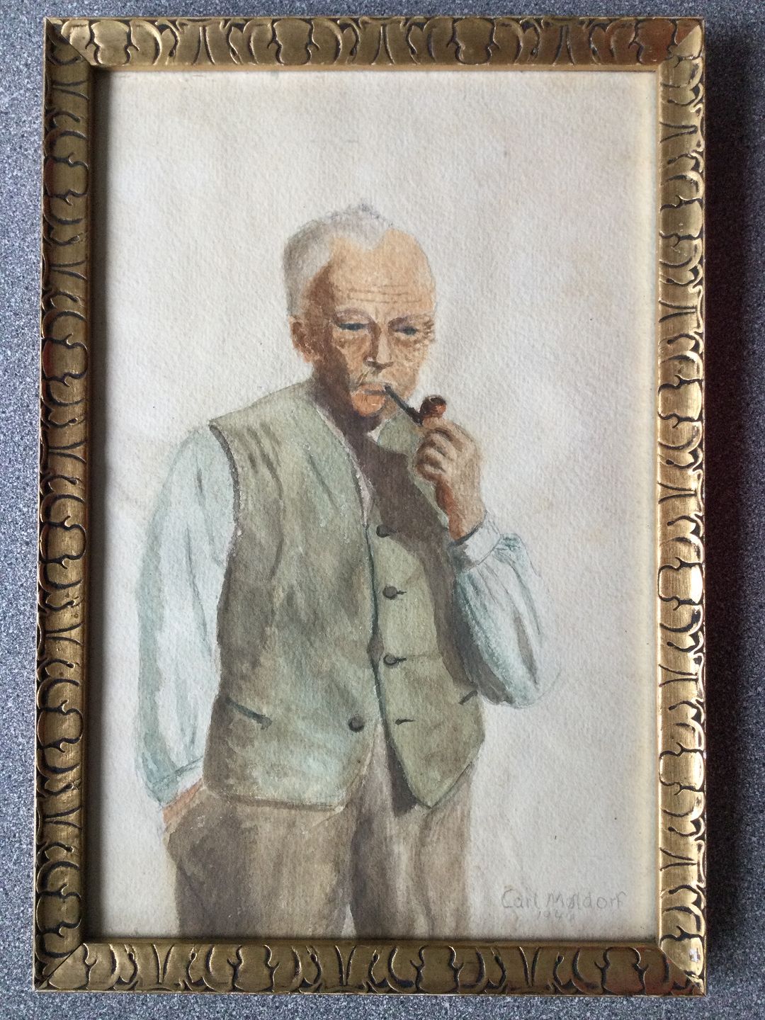 Akvarel af Carl Møldorf 1946 - Gammel mand med pibe.