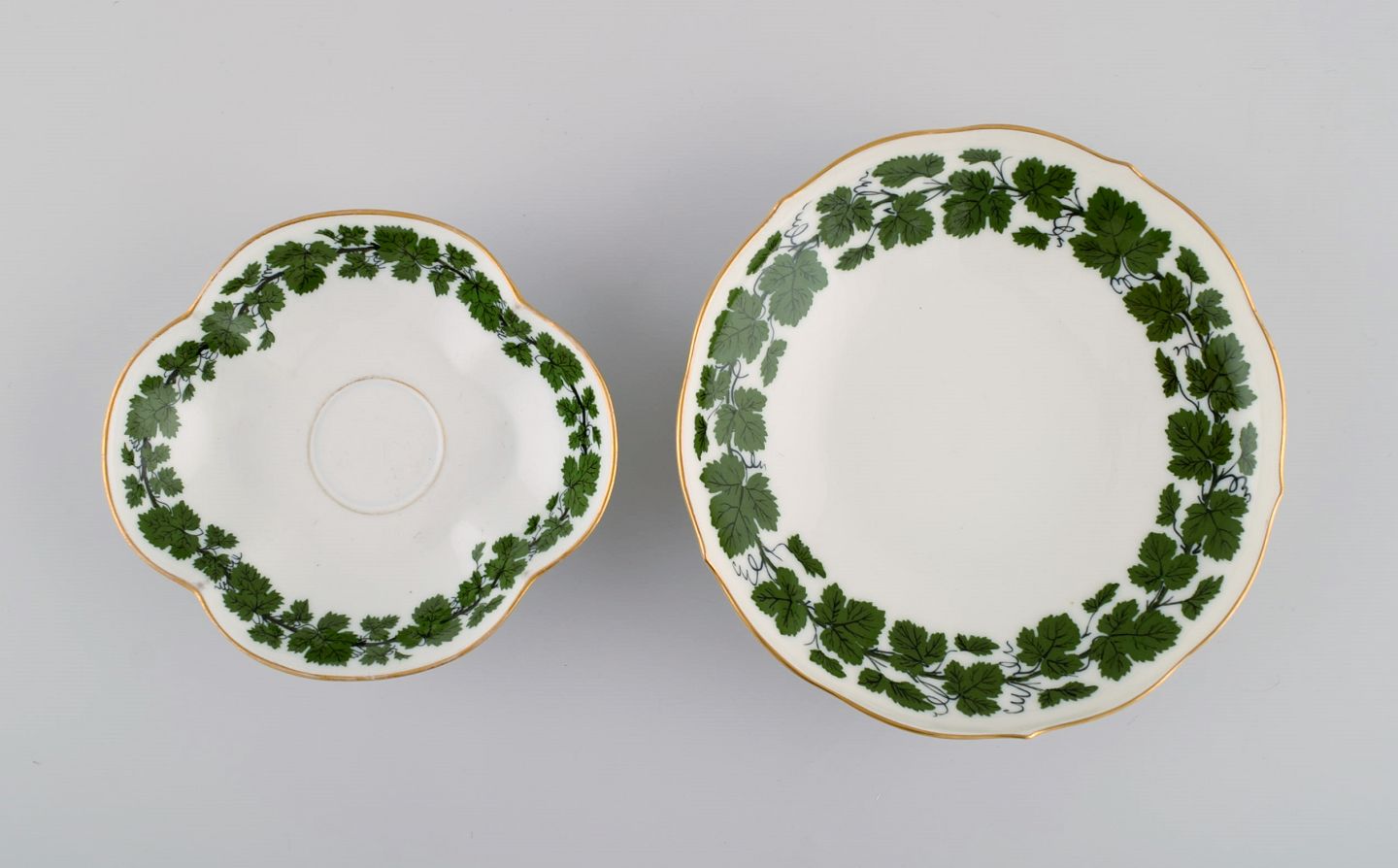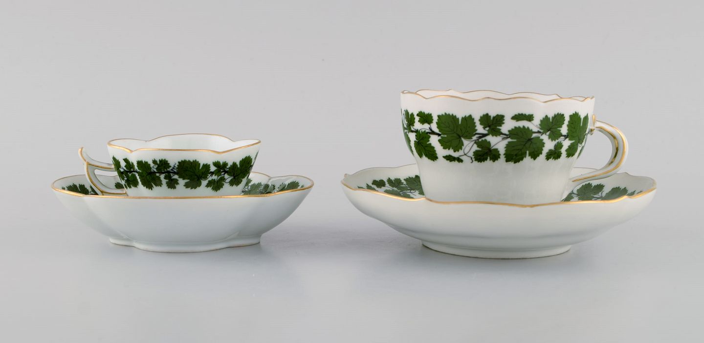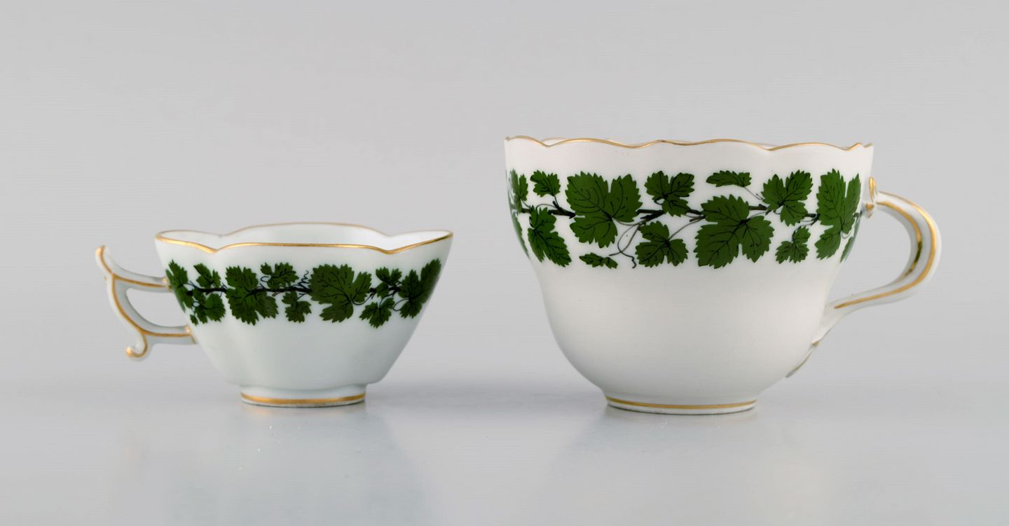 Meissen Green Ivy Vine Leaf mokka- og tekop i håndmalet porcelæn med guldkant. 1920/30'erne.